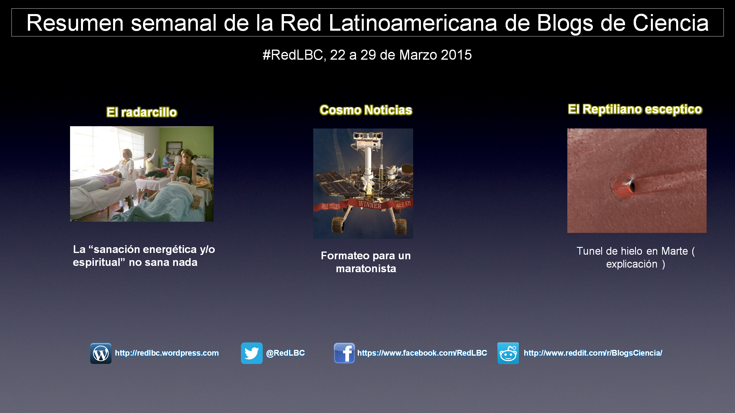 El radarcillo: El Reiki es una de las muchas «disciplinas» que aseguran que se peude curar mediante energia, y en los casos mas atrevidos, hasta a distancia, pero esta es otra de esas medicinas alternativas que no pasan las prubas necesarias para darles validez y credibilida. -> La “sanación energética y/o espiritual” no sana nada- Cosmo Noticias: Opportunity ha hecho un gran trabajo, pero, tanto ha sido ese trabajo, que su memoria estaba empezando a fallar, y esto habia ocacionado perdida de datos e informacion. -> Formateo para un maratonista