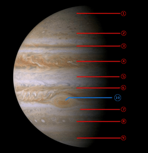 Las nubes de las regiones polares no se parecen en nada a las nubes que rodean las zonas ecuatoriales, en las que se alternan zonas de colores claros con cinturones oscuros que rodean el planeta. De hecho, las nubes de las regiones polares se muestran más enmarañadas y cuentan con numerosos sistemas de tormentas que rotan en sentido horario y antihorario.