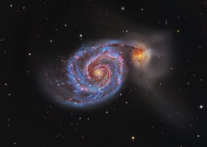M63 interacciona gravitacionalmente con M51 (en la imagen de la derecha), también conocida como la galaxia del Remolino, y varias galaxias de menor tamaño. La luz tarda alrededor de 35 millones de años en llegarnos desde M63 y unos 60 000 años en cruzar la galaxia espiral.