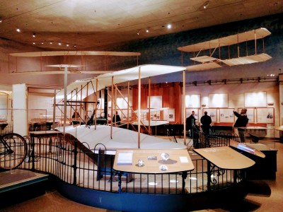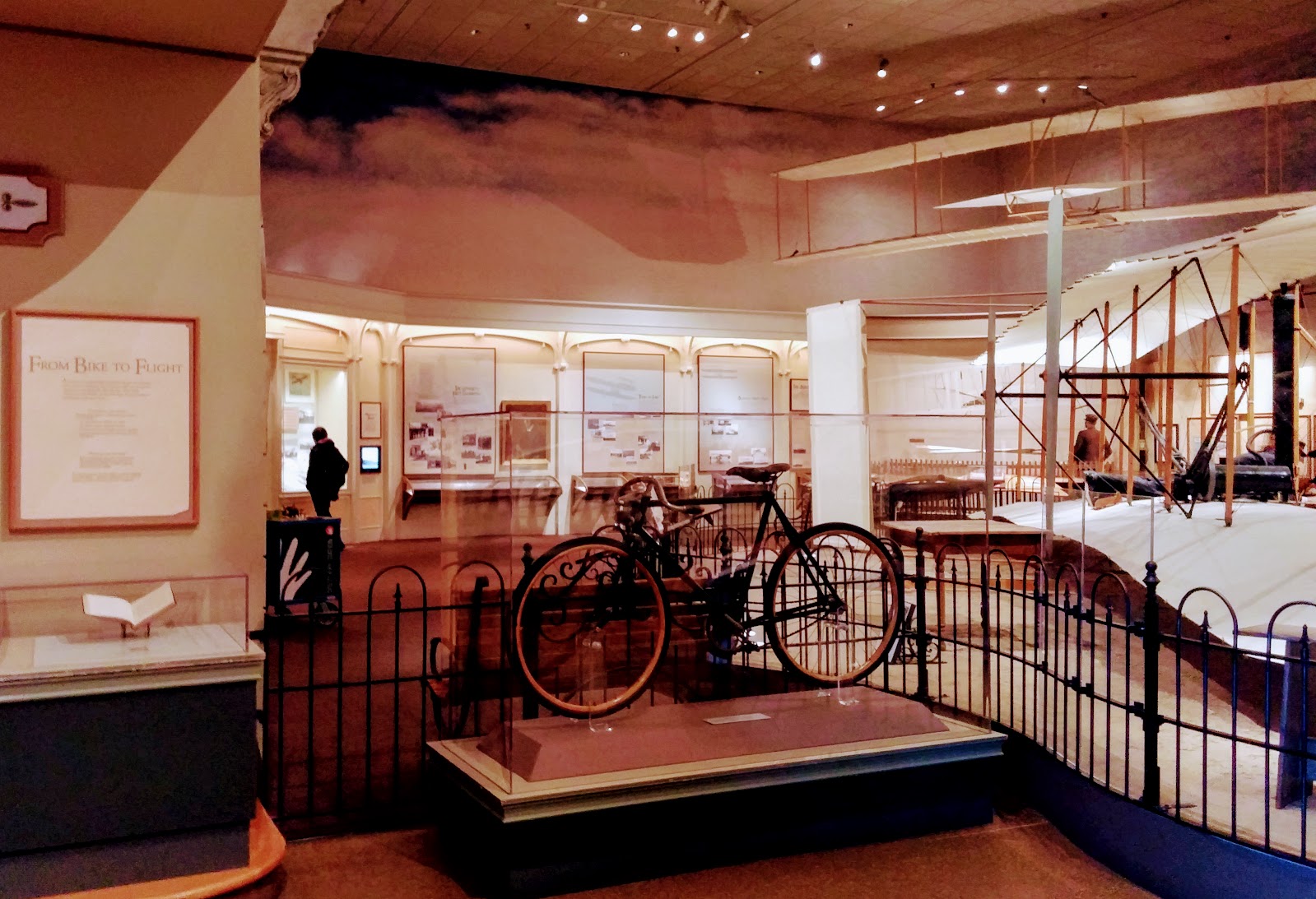 Un ejemplar de bicicleta fabricada por los hermanos Wright, junto al primer volador, en el museo Smithsoniano del aire y el espacio en Washington DC: