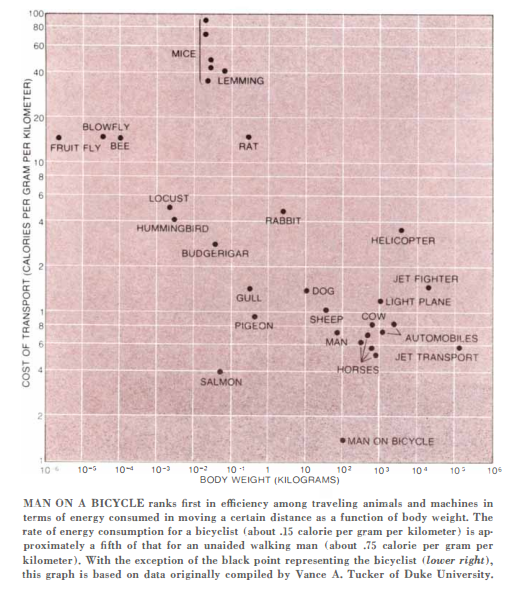 En este cuadro de la revista Scientific American de marzo de 1973, se puede apreciar que una persona en bicicleta (man on bicycle) es más eficiente que cualquier animal o máquina.