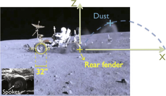 La misión Apolo 16 llevó un vehículo lunar y las filmaciones del mismo muestran cómo las ruedas levantan polvo lunar. El movimiento parabólico de esas partículas se puede analizar para demostrar que es coherente con la falta de atmósfera y con la aceleración lunar. Estos videos son de libre acceso y pueden ser analizados con herramientas muy sencillas de libre acceso como por ejemplo Tracker Video Analysis, tan usado en la enseñanza de la física.