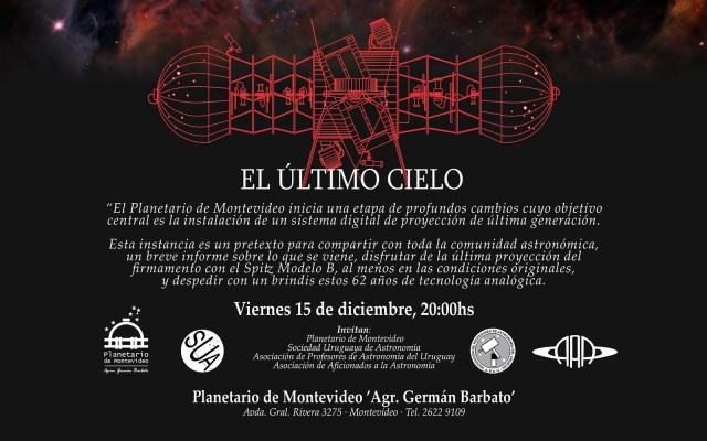 La noche del viernes 15 de diciembre, la comunidad astronómica uruguaya se dio cita para celebrar el inicio de una nueva etapa del Planetario de Montevideo, en un brindis organizado por el Planetario, la Sociedad Uruguaya de Astronomía, la Asociación de Profesores de Astronomía de Uruguay y la Asociación de Aficionados a la Astronomía. Con palabras del director Oscar Méndez acerca de los detalles del proyecto de renovación digital y un último y emotivo cielo analógico a cargo de Alejandro Castelar, se cerró la primera época, de casi 63 años, del primer Planetario de Iberoamérica.