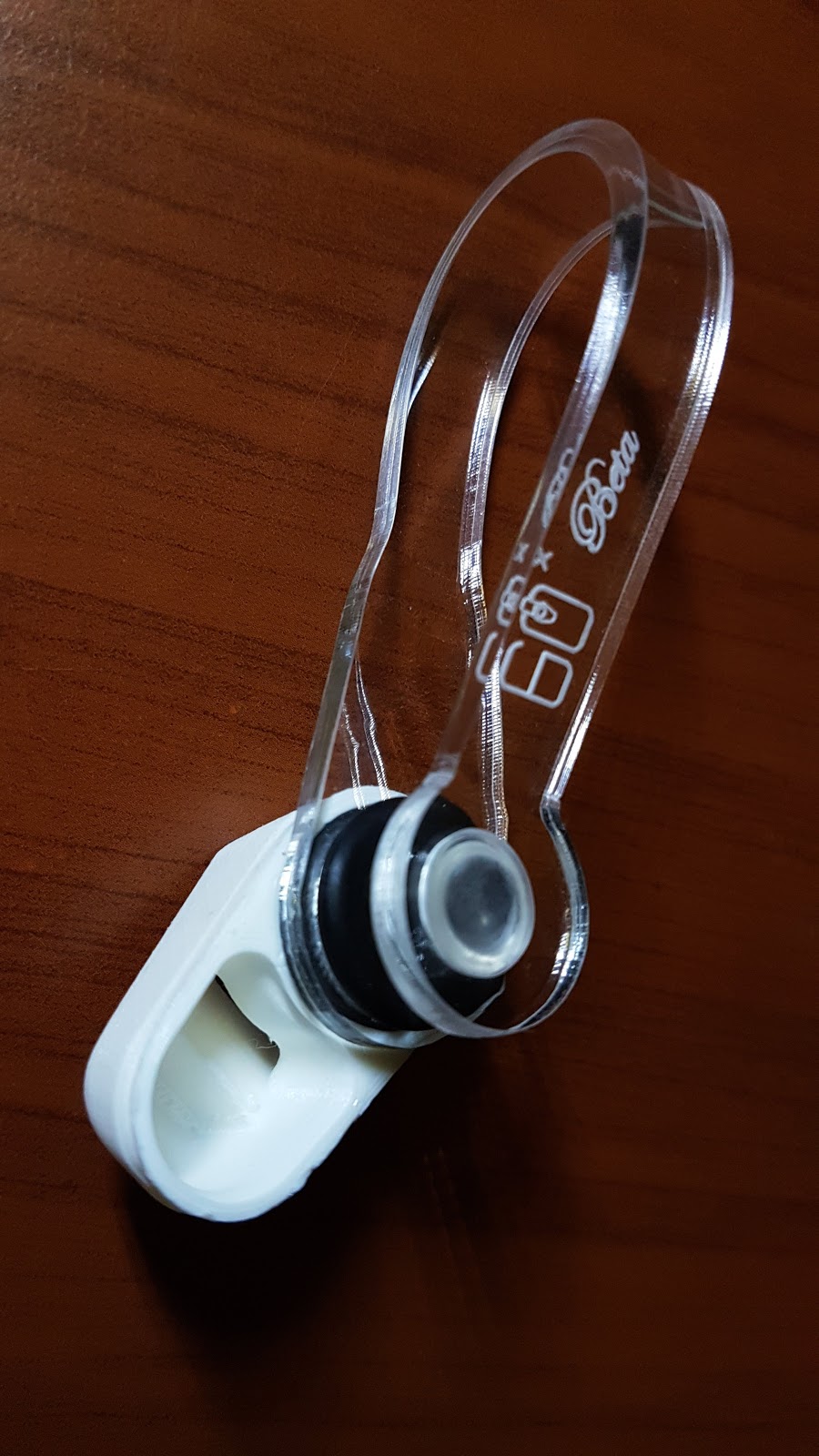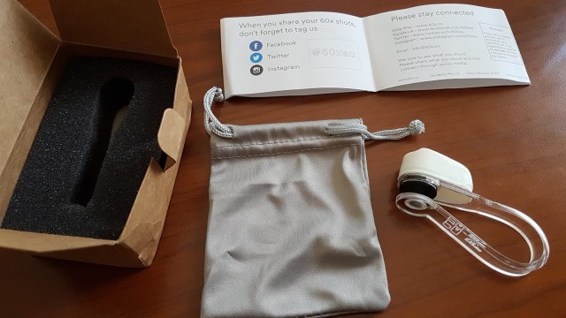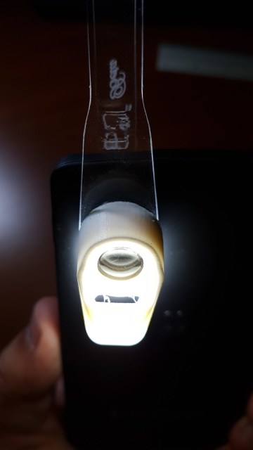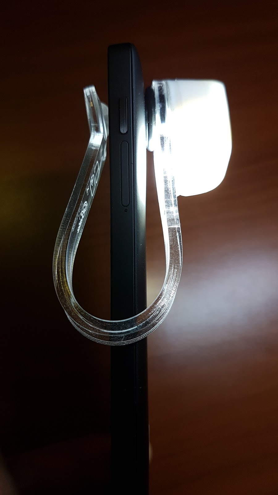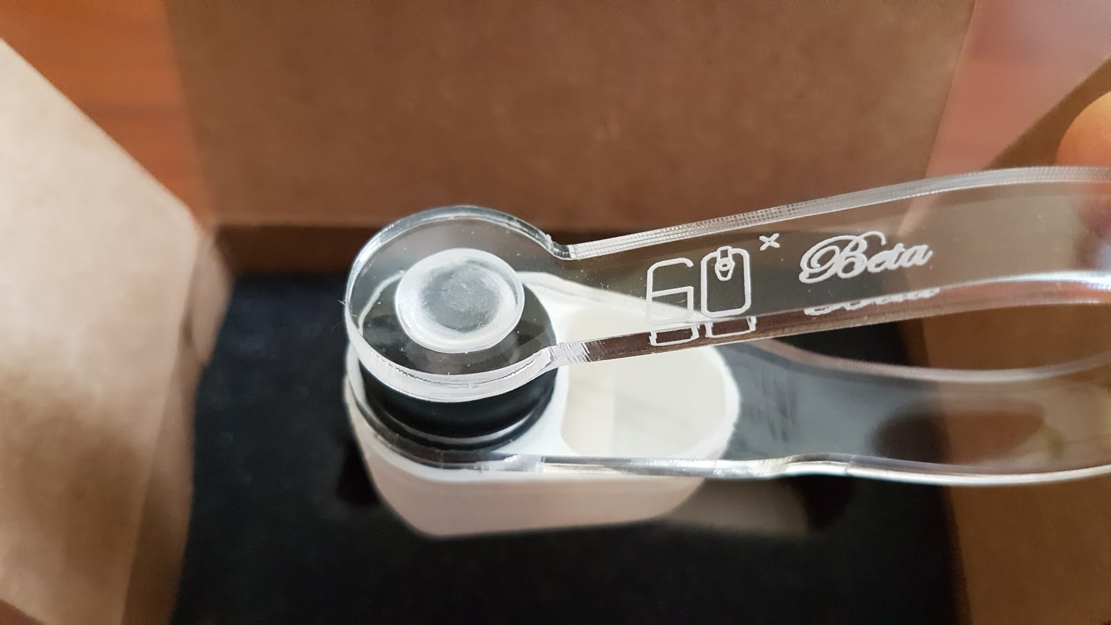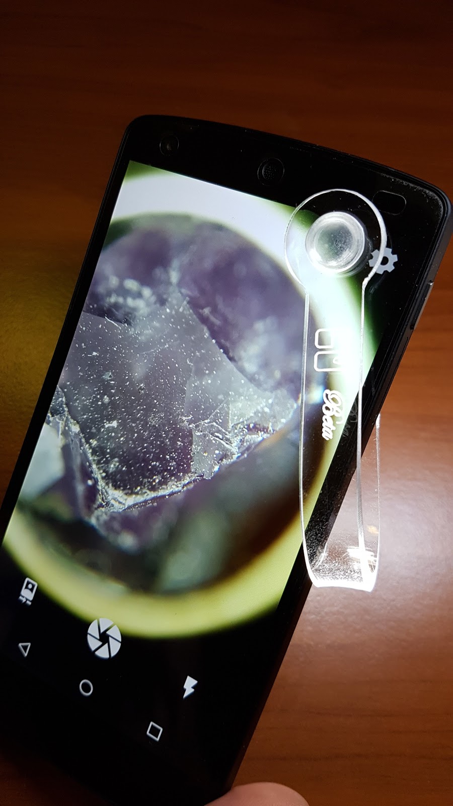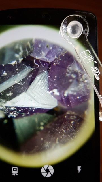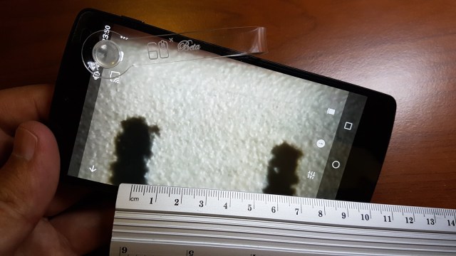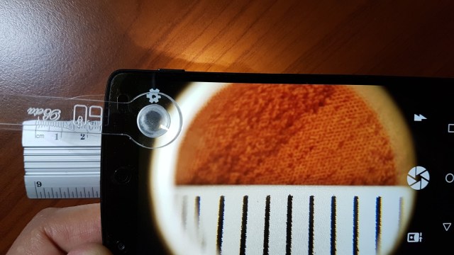 El diseño de este microscopio es interesante, una horquilla flexible con terminaciones de goma de ambos lados sirve para fijarlo suavemente al teléfono, apoyando de un lado en la pantalla y del otro sobre la cámara, sin lastimar las superficies del teléfono. Un accesorio blanco impreso en 3D rodea a la lente del microscopio y está diseñado para dirigir parte de la luz del flash hacia el objeto que se está observando. Esta pieza se puede girar, para adaptarse a las diferentes configuraciones de flash, según el modelo de teléfono. Así mismo, para poder utilizar el flash al mismo tiempo que la cámara (sin necesidad de filmar), se debe recurrir a alguna app diferente de la que viene por defecto con el teléfono. Una buena elección es la app gratuita Simple Camera. Esta app permite mantener el flash encendido, lo que garantiza una buena iluminación, vital para conseguir buenas imágenes en cualquier microscopio óptico.