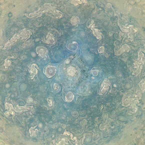 El enorme conjunto de datos enviados por la sonda Juno no están haciendo conocer un nuevo Júpiter. La sonda está diseñada para el conocimiento en profundo del planeta, más allá del reconocimiento fotográfico: es necesario penetrar en esa densa estructura gaseosa para llegar a los aspectos clave del planeta más grande de nuestro Sistema Solar. Hace un mes teníamos el primer reporte completo de los datos enviados por la sonda, que a pesar de no estar en su órbita planificada cumple notablemente con su misión. Lo último que la NASA ha dado a conocer sobre los datos de Juno son estas imágenes que muestran en detalle la compleja estructura del polo norte de Júpiter, conformada por ocho ciclones cuyos diámetros varían de entre 4.000 a 4.600 kilómetros.
