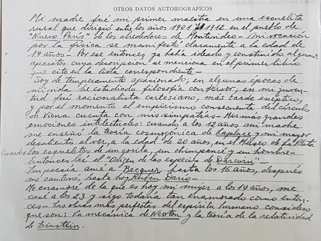 Mi madre fué mi primer maestra en una escuelita rural que dirigió entre los años 1901 y 1912 en el pueblo «Nuevo París» de los alrededores de Montevideo. Mi vocación por la física se manifestó se manifestó claramente a la edad de 14 años. Por ese entonces ya había ideado y construído algunos aparatos cuya descripción se menciona en el primer libro que cito en la lista correspondiente.