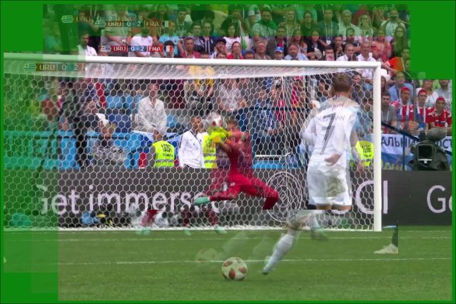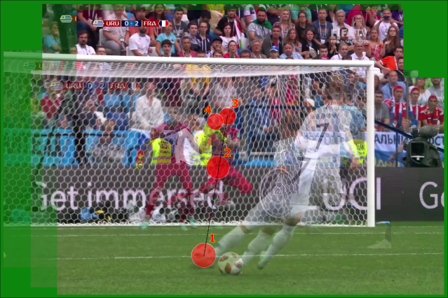 ANÁLISIS: A partir del video resumen del partido (que está más abajo), extraje algunas imágenes que redimensioné y sincronicé utilizando como referencias algunos elementos estáticos como el arco, para así poder apreciar la trayectoria de la pelota y los desplazamientos del golero sin la molestia del movimiento de la cámara. Con esas imágenes armé una animación, que está a continuación. Allí se puede seguir la secuencia de eventos y cómo cerca del arco la pelota cambia la trayectoria inicial dada por la secuencia 1-2-3 para desviarse hacia el punto 4. Se puede apreciar también que en el tiempo 4 la cabeza de Muslera coincide con la trayectoria original 1-2-3. Pero ahí ya es muy tarde porque la pelota se ha desviado súbitamente y por eso las manos de Muslera ya no están centradas con su cuerpo sino que se encuentran desplazadas para intentar acompañar el movimiento de último momento de la pelota.