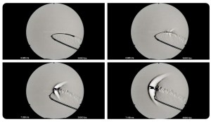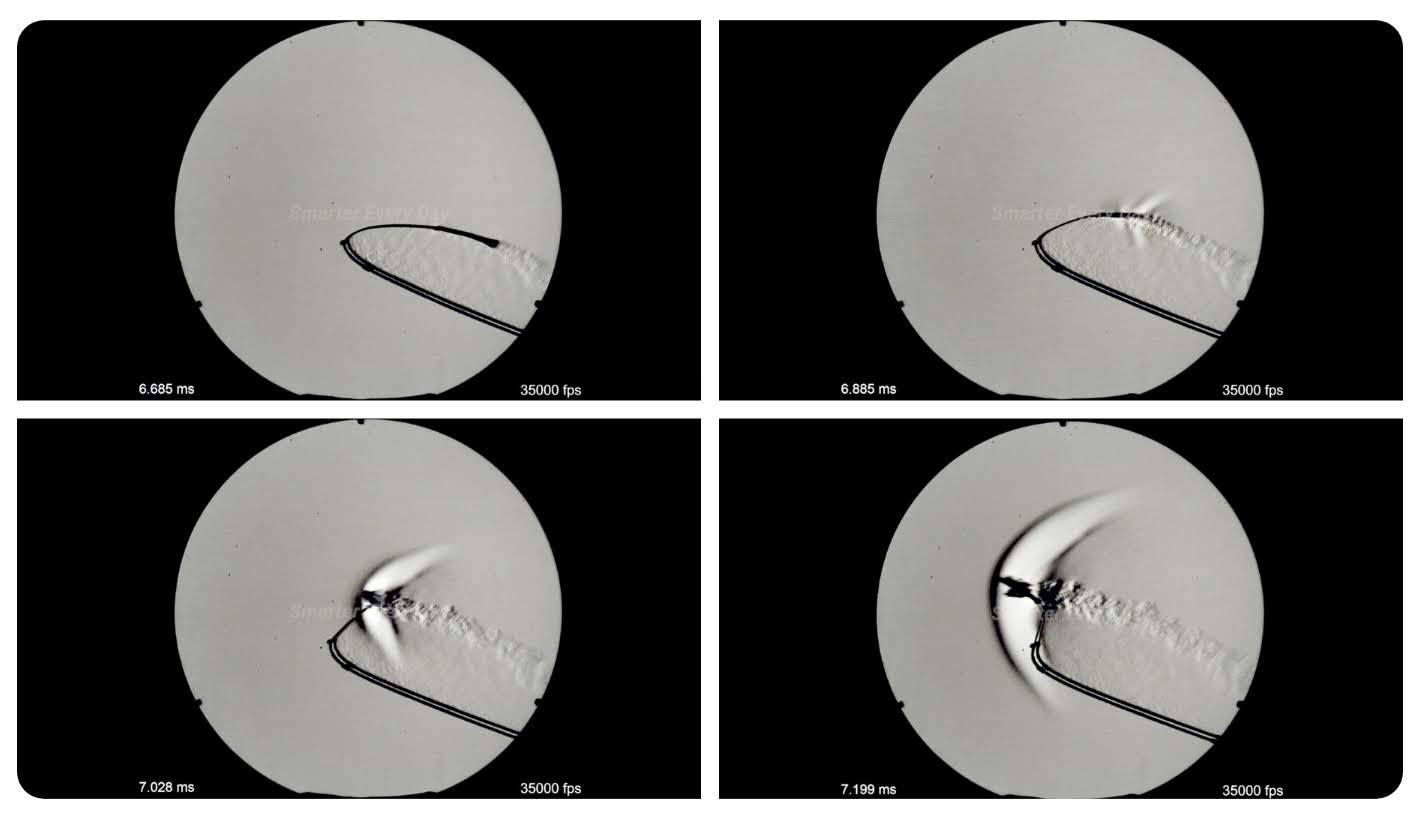 En esta imagen se observan 4 fotogramas seleccionados del momento en que se produce la onda de choque. El tiempo total de la secuencia es de apenas medio milisegundo.