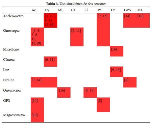 En las tablas 2 y 3 se muestra el panorama general del uso simultáneo de sensores. En la tabla 2 se muestra un breve resumen del uso de los sensores. Como se aprecia en los ejemplos analizados, el uso sincrónico de varios sensores de un teléfono inteligente abre la posibilidad a numerosos experimentos de física. La mayoría de los teléfonos inteligentes modernos tienen alrededor de una docena de sensores. Con un cálculo simple se puede estimar que utilizando solo dos sensores hay alrededor de medio centenar de combinaciones posibles. En la tabla 3 representamos con recuadros rojos las combinaciones de dos sensores que se han empleado en al menos un experimento (ver referencias). Las celdas en blanco corresponden a lugares en los que, hasta ahora, no se han hecho propuestas. Así pues, dejemos que nuestra imaginación se estimule y genere nuevos experimentos.