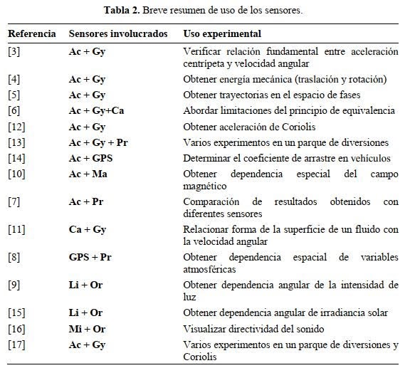 Recientemente en la literatura se han propuesto numerosos experimentos de física basados en teléfonos inteligentes [ver referencias 1 a 18]. Estos experimentos aprovechan los sensores incorporados en el teléfono inteligente como el acelerómetro, el giroscopio (sensor de velocidad angular), el magnetómetro, el sensor de proximidad, el luxómetro (luz ambiental), el barómetro (presión), entre otros. Por lo general, solo se usa un sensor en cada experimento. Cabe destacar que los teléfonos inteligentes también nos permiten medir simultáneamente con varios sensores. Esto es un gran beneficio ya que permite realizar una gran cantidad de experimentos, incluso en exteriores, evitando la dependencia de instrumentos delicados y costosos. Dado que consideramos que esta capacidad no se ha explotado por completo, en esta presentación discutimos algunos experimentos que involucran el uso de más de un sensor del teléfono inteligente y al final presentamos algunas perspectivas. En la tabla 1, enumeramos los sensores más utilizados y las abreviaturas utilizadas en este texto.