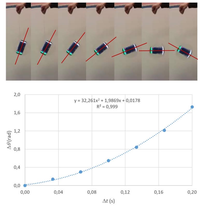 Un breve análisis teórico se da en la siguiente sección. Después de eso, en la Sección 3, describimos la configuración experimental que consiste esencialmente en un yo-yo casero al que se adosó un teléfono inteligente. En el experimento propuesto, el yo-yo se lanza varias veces mientras el sensor giroscópico incorporado registra la velocidad angular. Para complementar el análisis, también registramos el experimento con una cámara digital. En la Sección 4 presentamos y discutimos los resultados. Gracias al sensor del teléfono inteligente, se mide la velocidad angular, mientras que la aceleración angular se obtiene fácilmente mediante un ajuste lineal. El ángulo, obtenido del análisis de video, permite obtener la aceleración angular utilizando un ajuste cuadrático. Comparamos la aceleración angular obtenida por ambos métodos y corroboramos su coherencia. Finalmente en la Sección 5 discutimos las conclusiones y las perspectivas. Este experimento, cuyos requisitos previos incluyen esencialmente un conocimiento básico de las ecuaciones de Newton, está dirigido a estudiantes de secundaria o de primer año universitario.