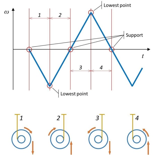 La perspectiva general del comportamiento temporal mostrado en la Fig. 4, se puede entender a la luz de la discusión presentada en la sección 2. El diente de sierra comprende secciones con pendientes aproximadamente constantes cuyos valores (opuestos) corresponden a las ecuaciones 4-5. Además, los cambios de pendiente ocurren cuando el yo-yo alcanza el punto más bajo y los ceros corresponden al paso cerca del punto de apoyo (o la mano). En el panel inferior de la Fig. 4, se muestran dos ventanas temporales ampliadas. En cada intervalo, el yo-yo sube, alcanza el soporte y baja, pero, como se indica en el párrafo anterior, gira en direcciones opuestas.