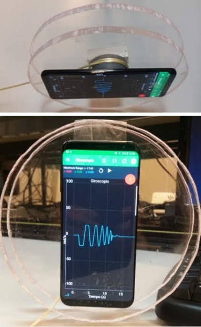 El teléfono inteligente es un Samsung S8+ que incluye un giroscopio incorporado. En la Fig. 3 mostramos nuestro dispositivo experimental. La aplicación Physics Toolbox Suite [17] se utilizó para registrar los datos experimentales y exportar a un archivo CSV (valores separados por comas). En el panel inferior se puede apreciar una captura de pantalla de la aplicación que muestra la evolución temporal de la velocidad angular durante todo el movimiento.