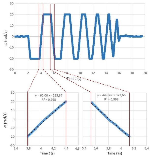 lo que resulta en una aceleración angular \( \alpha = 64,52 rad/s^2 \). Este valor aparece muy cerca del obtenido previamente usando el sensor del teléfono inteligente con solo una desviación de \( 0,7 \% \).