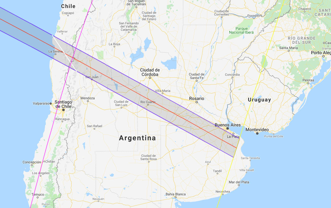 La sombra de totalidad (franja en el mapa y punto negro en la simulación) será visible desde parte de Chile y Argentina. En cada localidad el eclipse total tendrá una duración de entre 2 y 3 minutos.