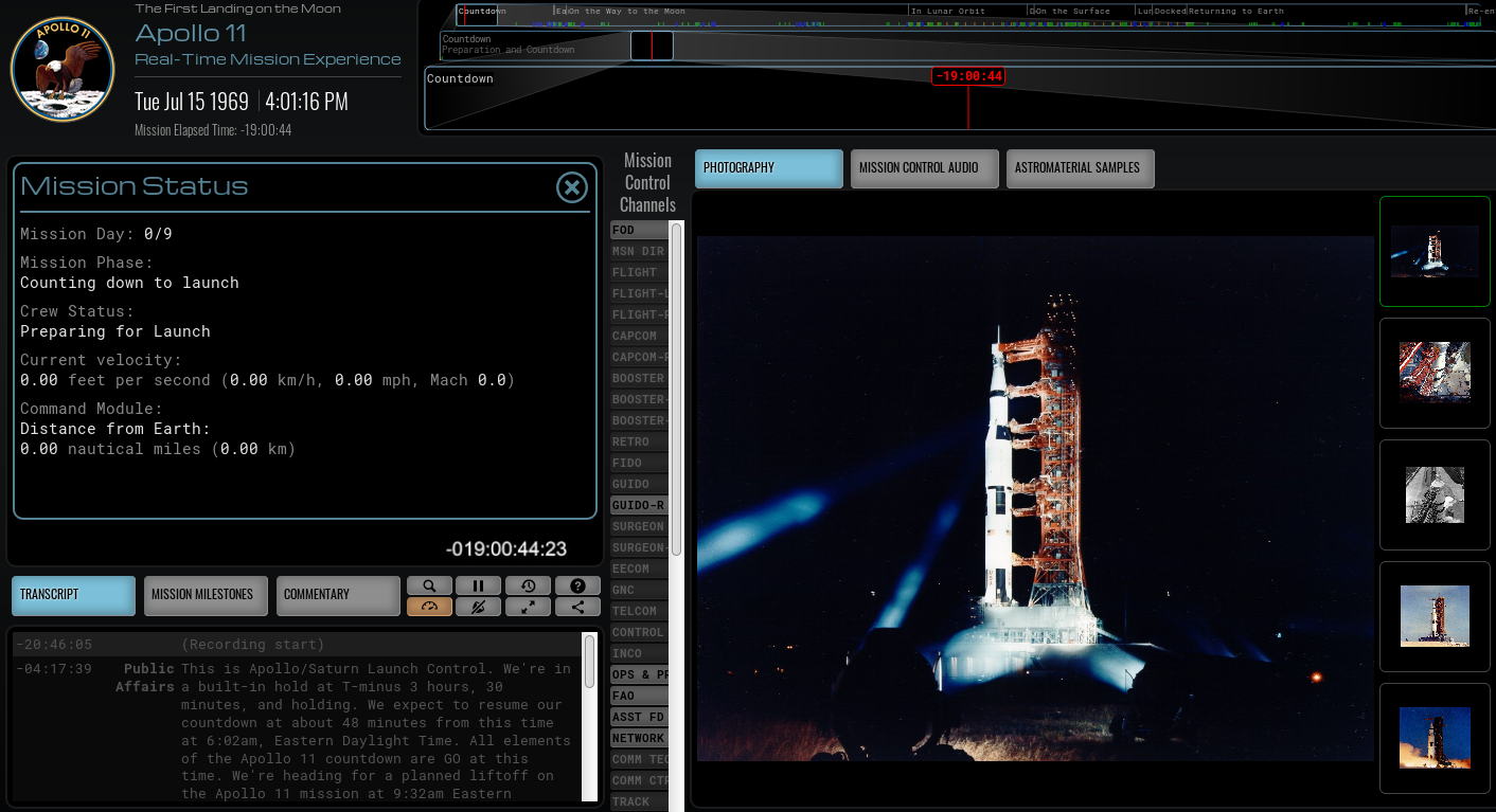 Hoy de mañana tuve el placer de seguir en tiempo real el despegue del Apolo 11 gracias a Apollo in Real Time, un proyecto web alucinante que reúne en una interfase gráfica interactiva todos los datos recopilados por esta histórica misión. El proyecto integra todas las filmaciones de la sala de control de Houston, las transmisiones de los astronautas y las 11.000 horas de audio intercambiados. El archivo fotográfico integrado a esta aplicación es de unas 2.000 imágenes, incluyendo datos de los experimentos realizados por la tripulación.