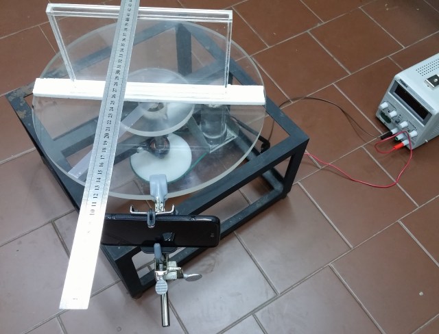 El monteje experimental que se muestra en la figura 2 consiste en un contenedor prismático y un teléfono inteligente, modelo Samsumg Galaxy S5 (con cámara digital y giroscopio incorporado), ambos fijados a una mesa giratoria. Las dimensiones del recipiente que contenía agua teñida eran 25 cm de ancho, 15 cm de altura y 2 cm de espesor. La mesa giratoria funcionaba con un motor de corriente continua, por lo que la velocidad de rotación podía ajustarse variando el voltaje aplicado al motor.