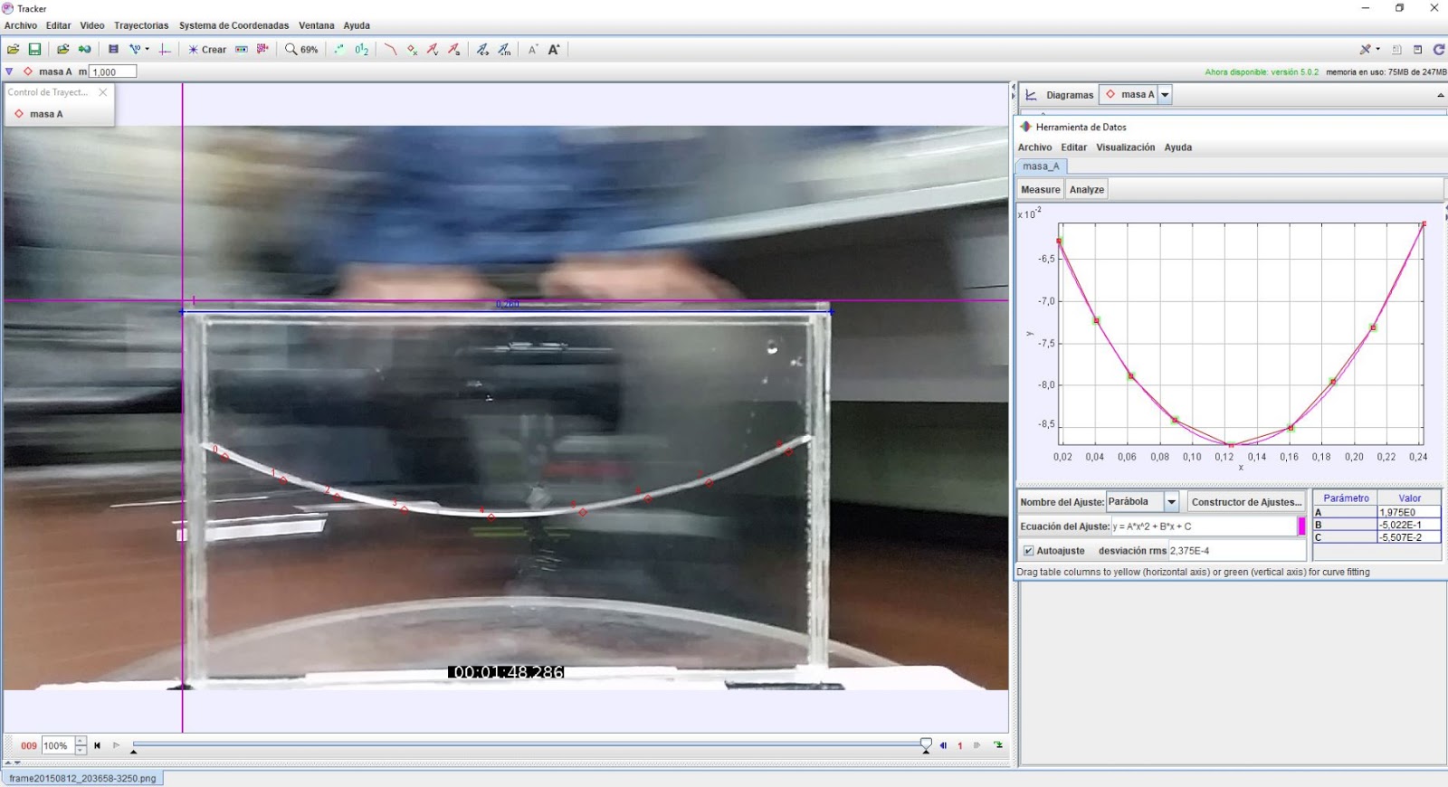 Fig. 4. Captura de pantalla del Tracker que muestra un cuadro del video digital con la superficie libre y los puntos seleccionados (izquierda). El panel derecho muestra la forma parabólica y las coordenadas de los puntos seleccionados.