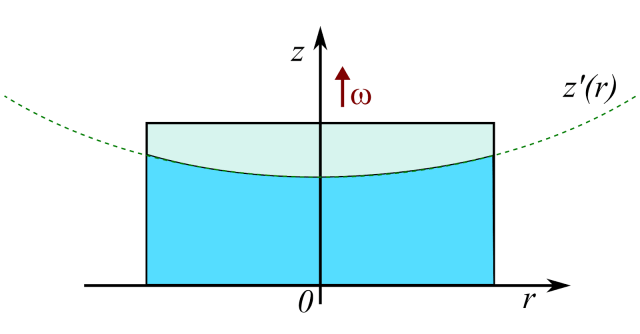 Fig. 1. Un líquido en un recipiente prismático con una superficie libre, \( z'(r) \), montado en una mesa giratoria con velocidad angular \( \omega \). Muestra una forma parabólica. La figura también indica la definición de los ejes de coordenadas en el sistema relativo.