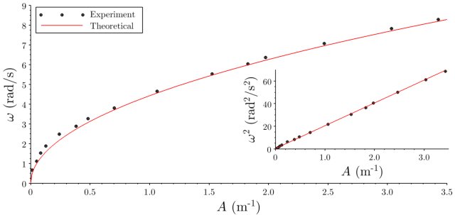 Después de que se procesaron los datos, comparamos los resultados para la concavidad y la altura de la parábola con la predicción del modelo. La figura 5 muestra la relación experimental entre la concavidad de la parábola y la velocidad angular y la predicción del modelo. La pendiente del ajuste lineal, \( 20.16(4) m · rad^2 / s^2 \), de acuerdo con la ecuación 9, está en buen acuerdo con \( 2 g \).