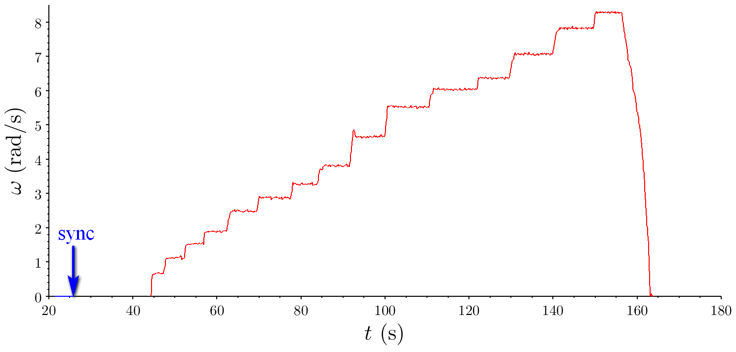 Luego, encendemos la fuente de alimentación y la mesa giratoria comienza a girar. A lo largo del experimento, la fuente de alimentación se aumenta lentamente con pequeños saltos, al igual que la velocidad angular. La figura 3 muestra la evolución temporal de la velocidad angular. La flecha azul indica el tiempo utilizado para sincronizar el video y los datos del sensor. Al final del experimento, ambos archivos, video y datos del sensor se transfieren a una computadora. El video que está más abajo muestra una sinopsis del experimento.