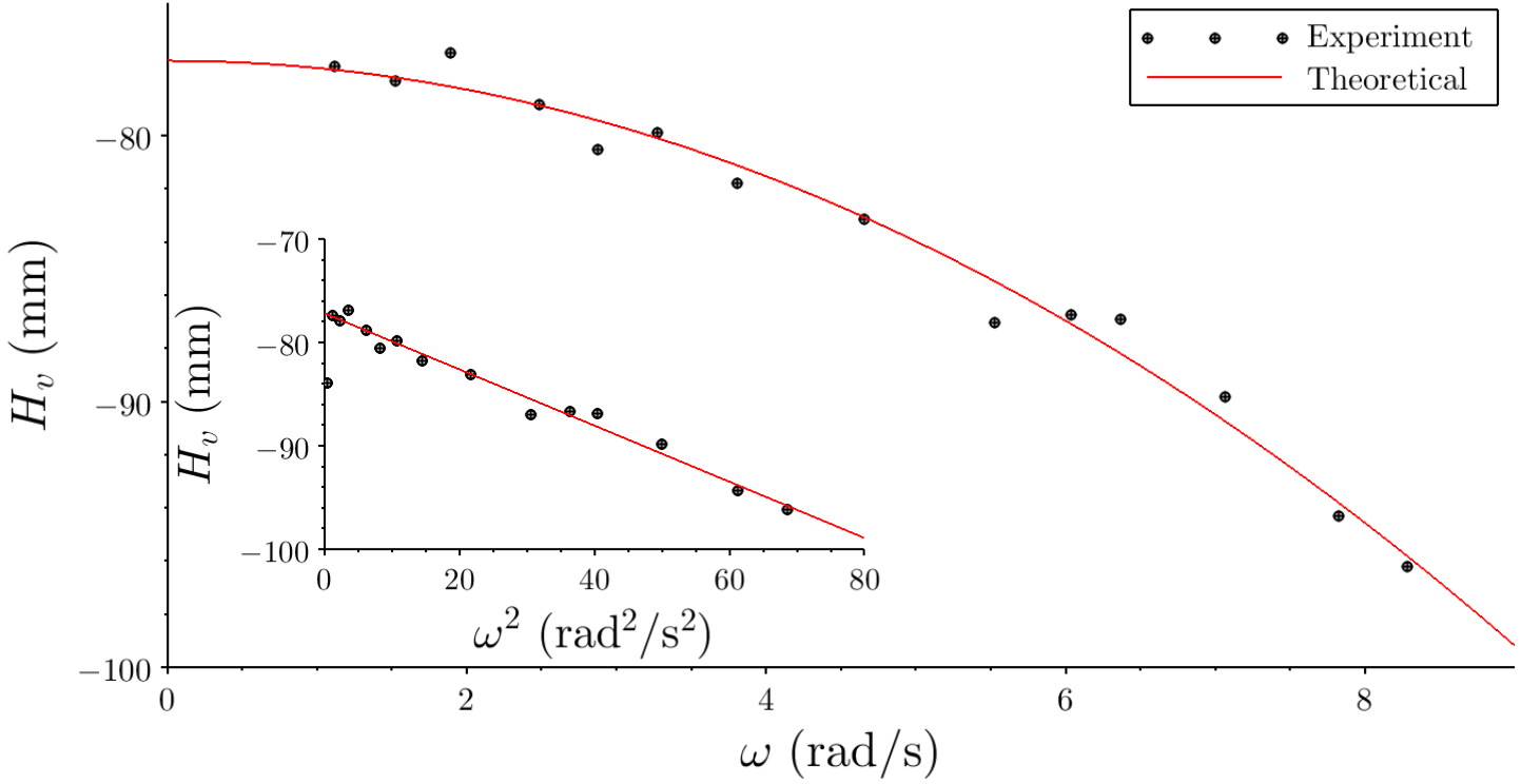 La altura del vértice de la parábola en función de la velocidad angular al cuadrado se representa en la figura 6. La pendiente del ajuste lineal resulta \( −0.27(1) mm s^2 / rad^2 \), que es muy similar al valor dado por el modelo, según la ecuación 10, \( − L^2 / 24 g = −0.2655(5) mm s^2 / rad^2 \). Además, el término independiente de la recta de ajuste corresponde al nivel del agua con la mesa giratoria en reposo. En el experimento, el valor obtenido es \( −7.72(3) cm \), mientras que el valor obtenido midiendo directamente en la imagen es \(−7.6 (2) cm \).
