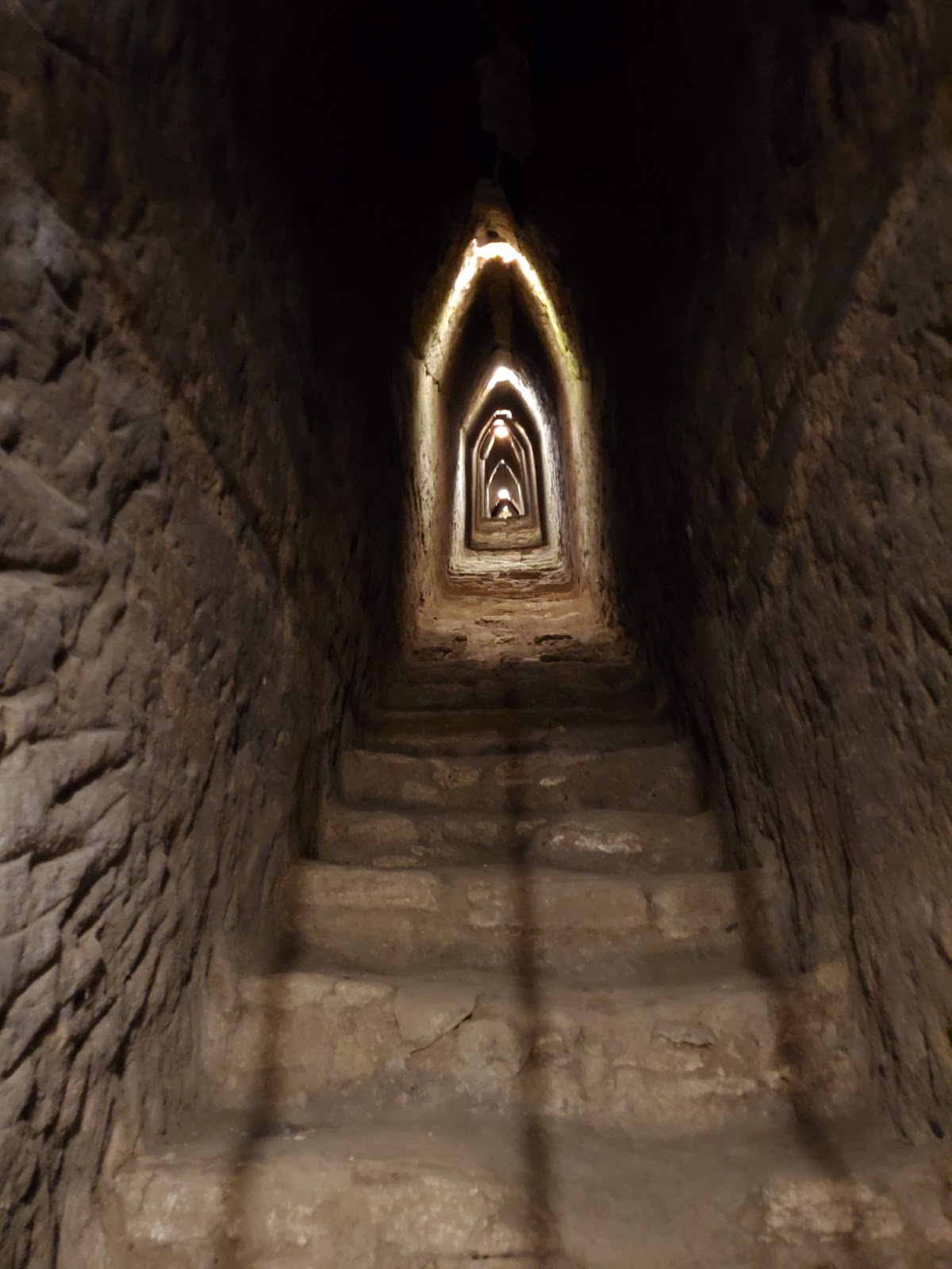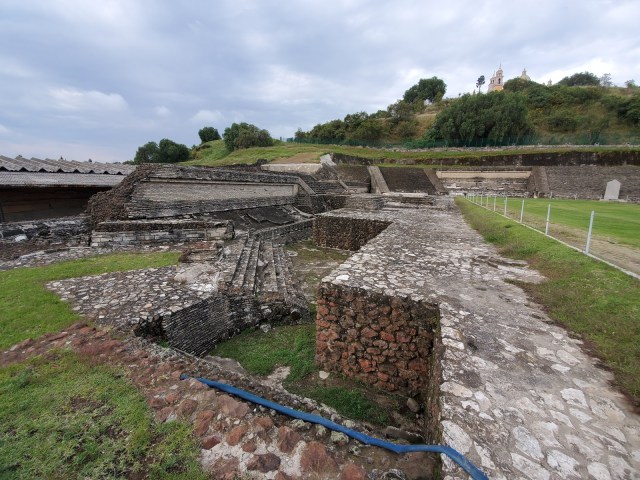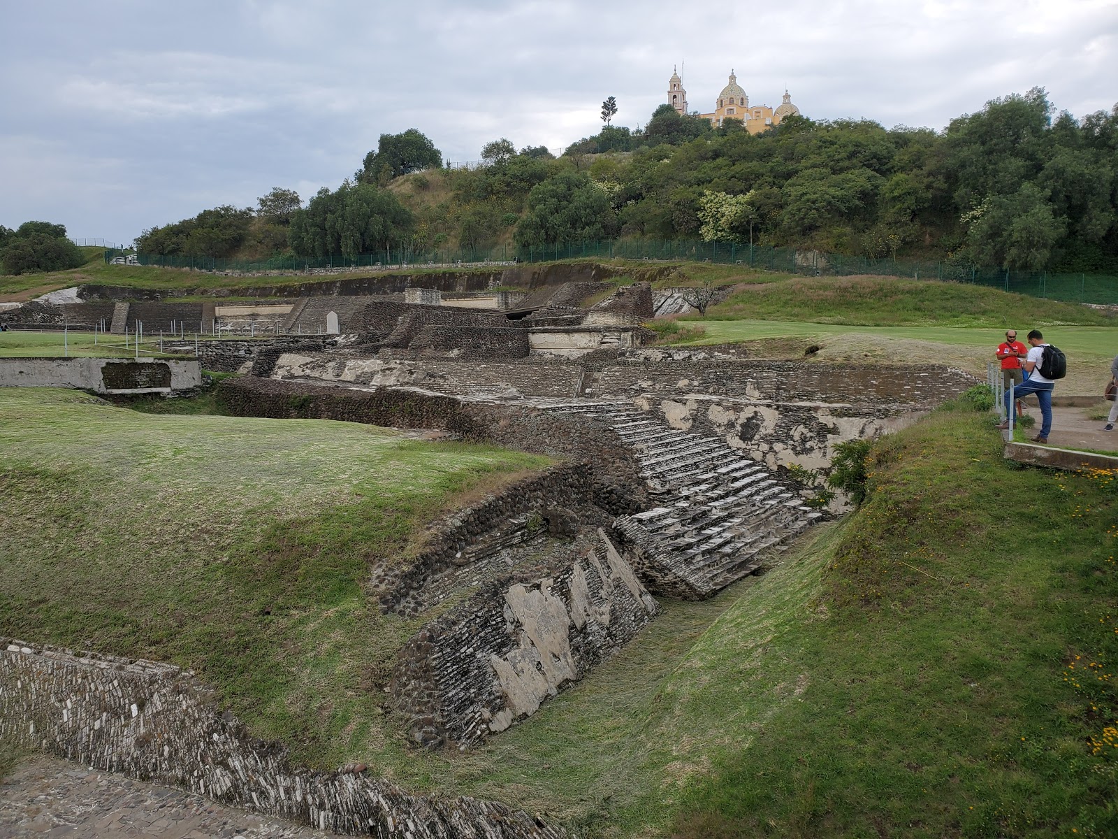 Casi el único fragmento visible de la gran pirámide de Cholula. (Ver la maqueta anterior). En la cima, a lo lejos, se aprecia la catedral de Cholula.