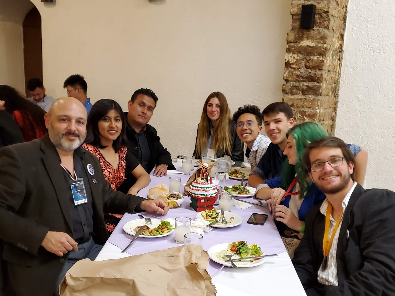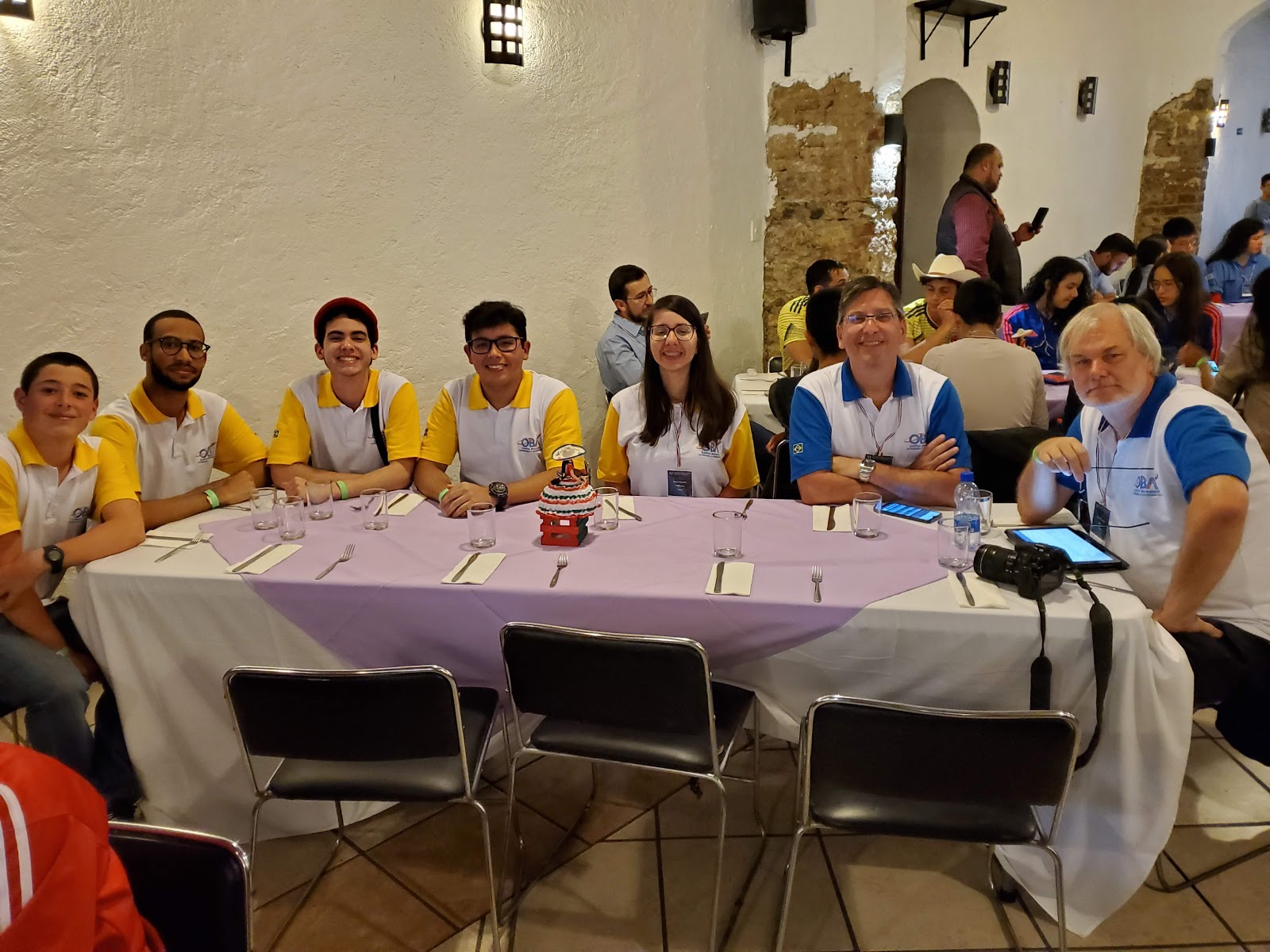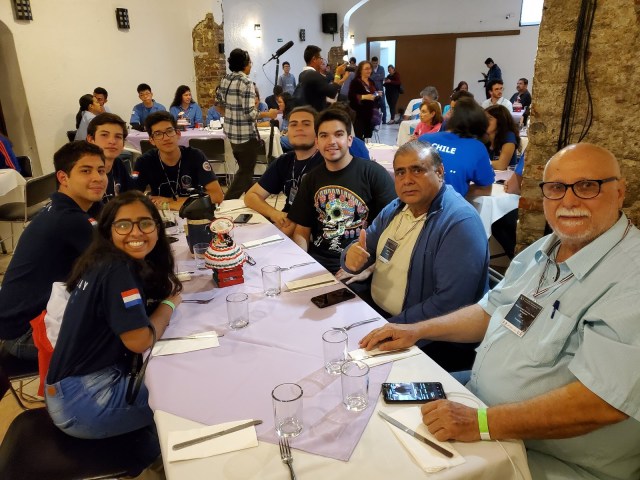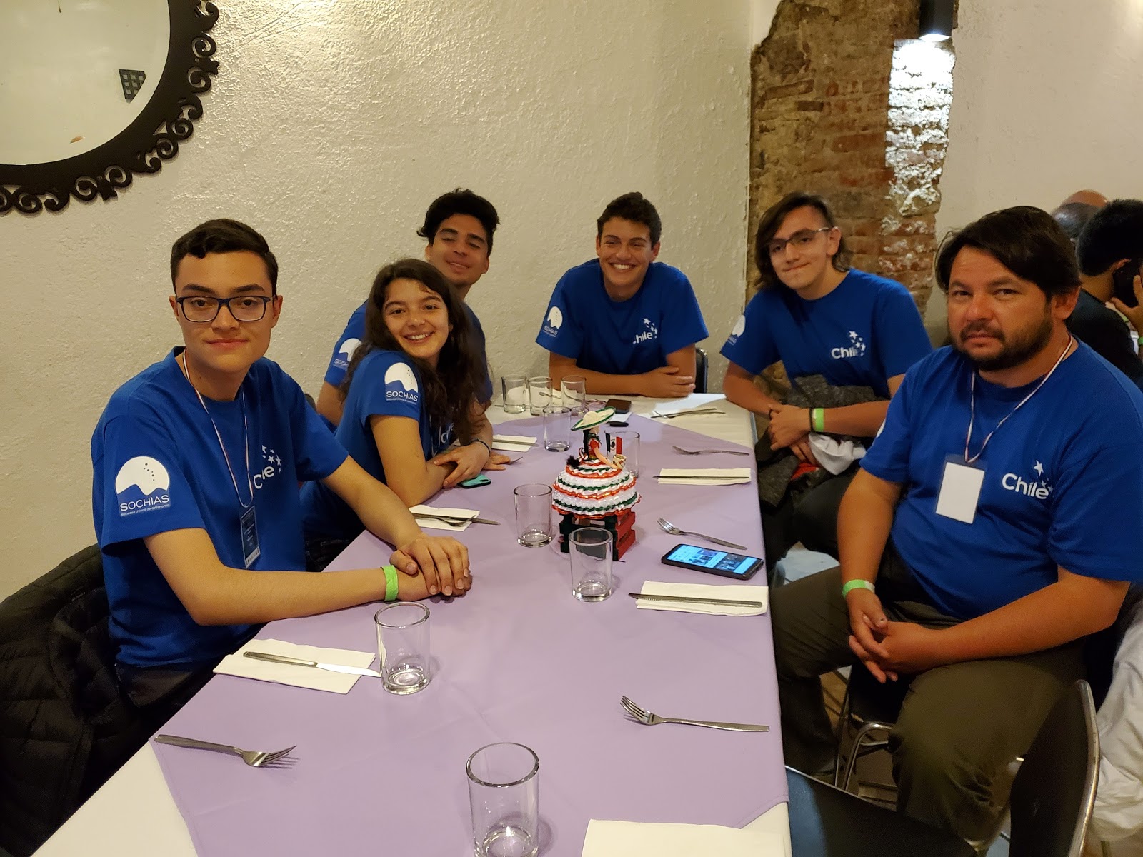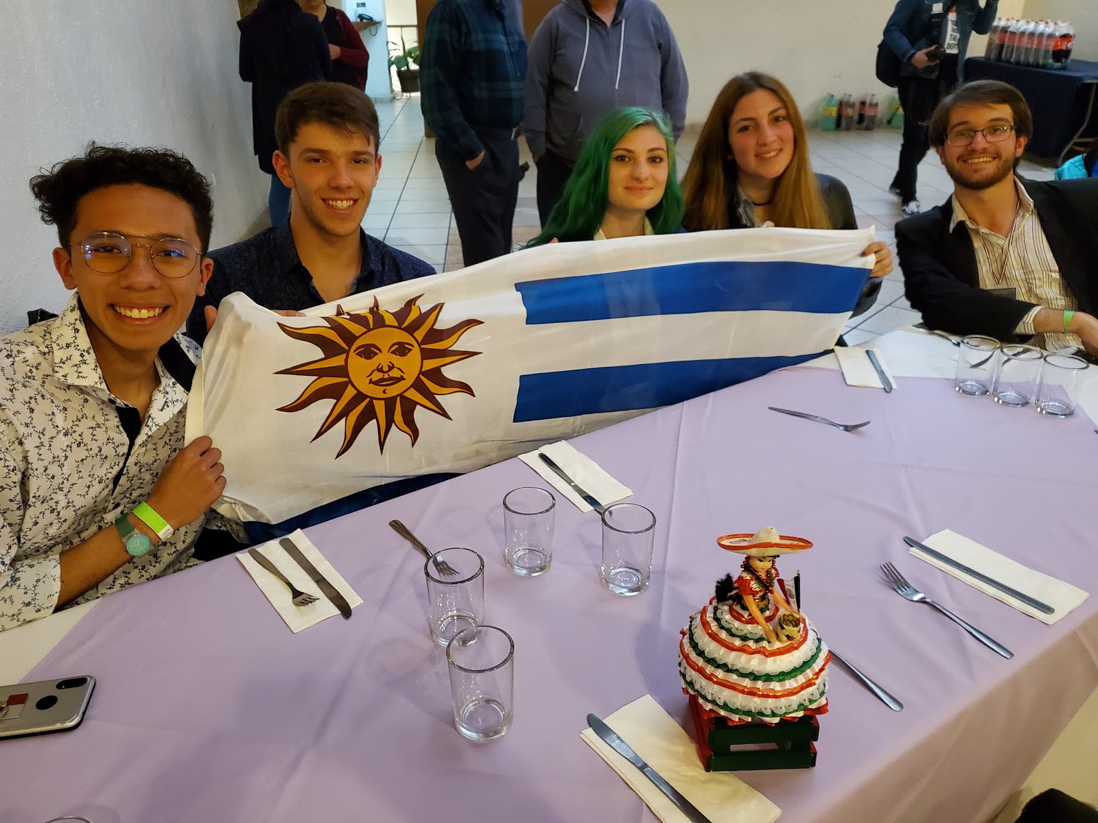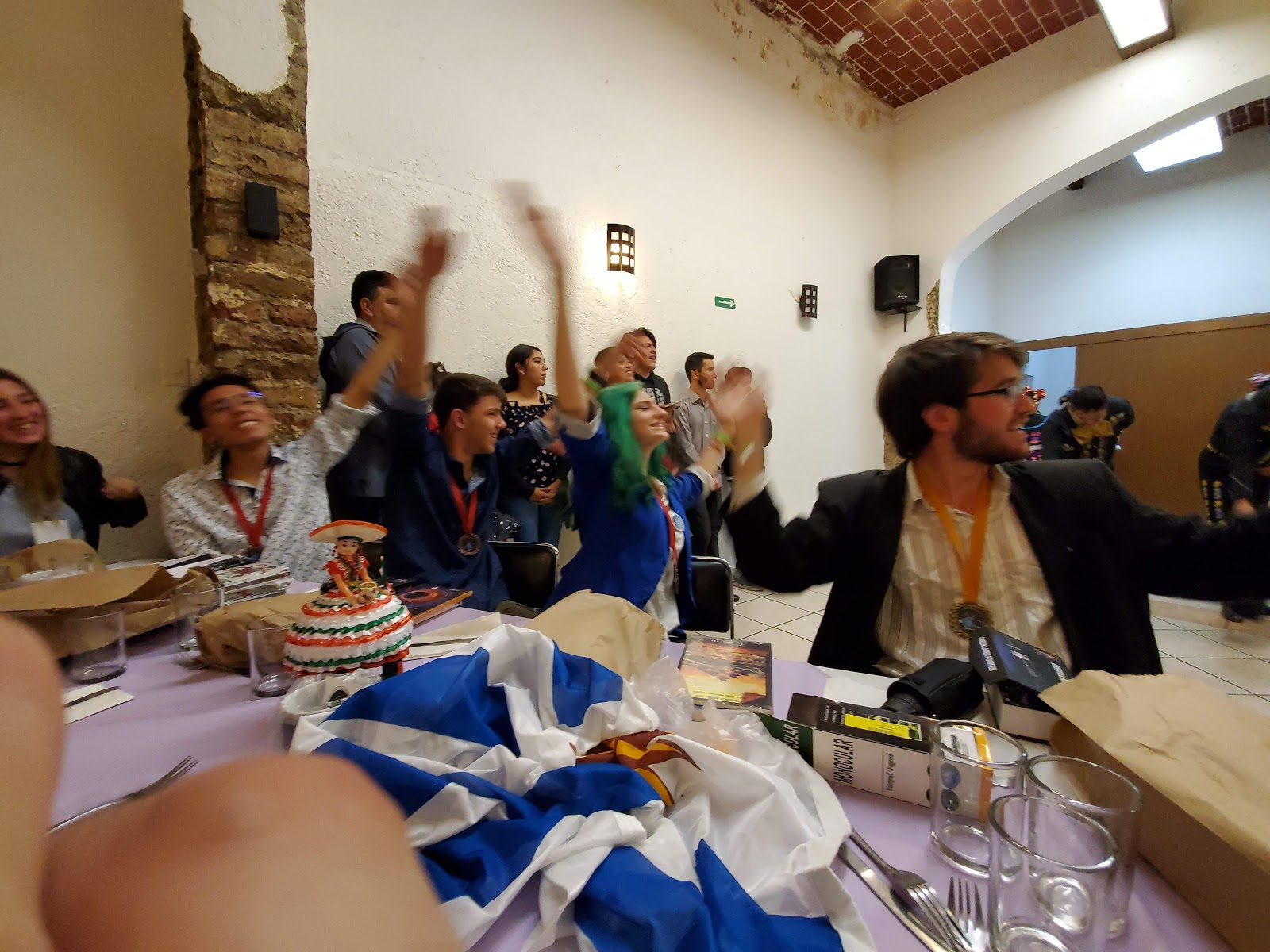 Delegación de Uruguay cenando con Daniela Reyes y Eduardo Valadez, coordinadores de logística de la Olimpiada.