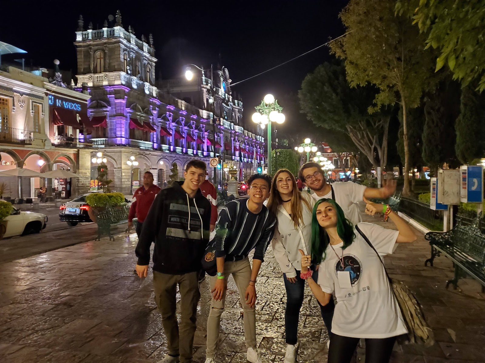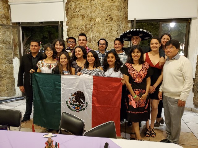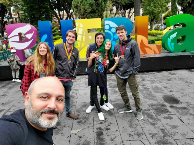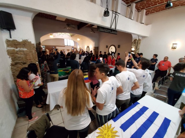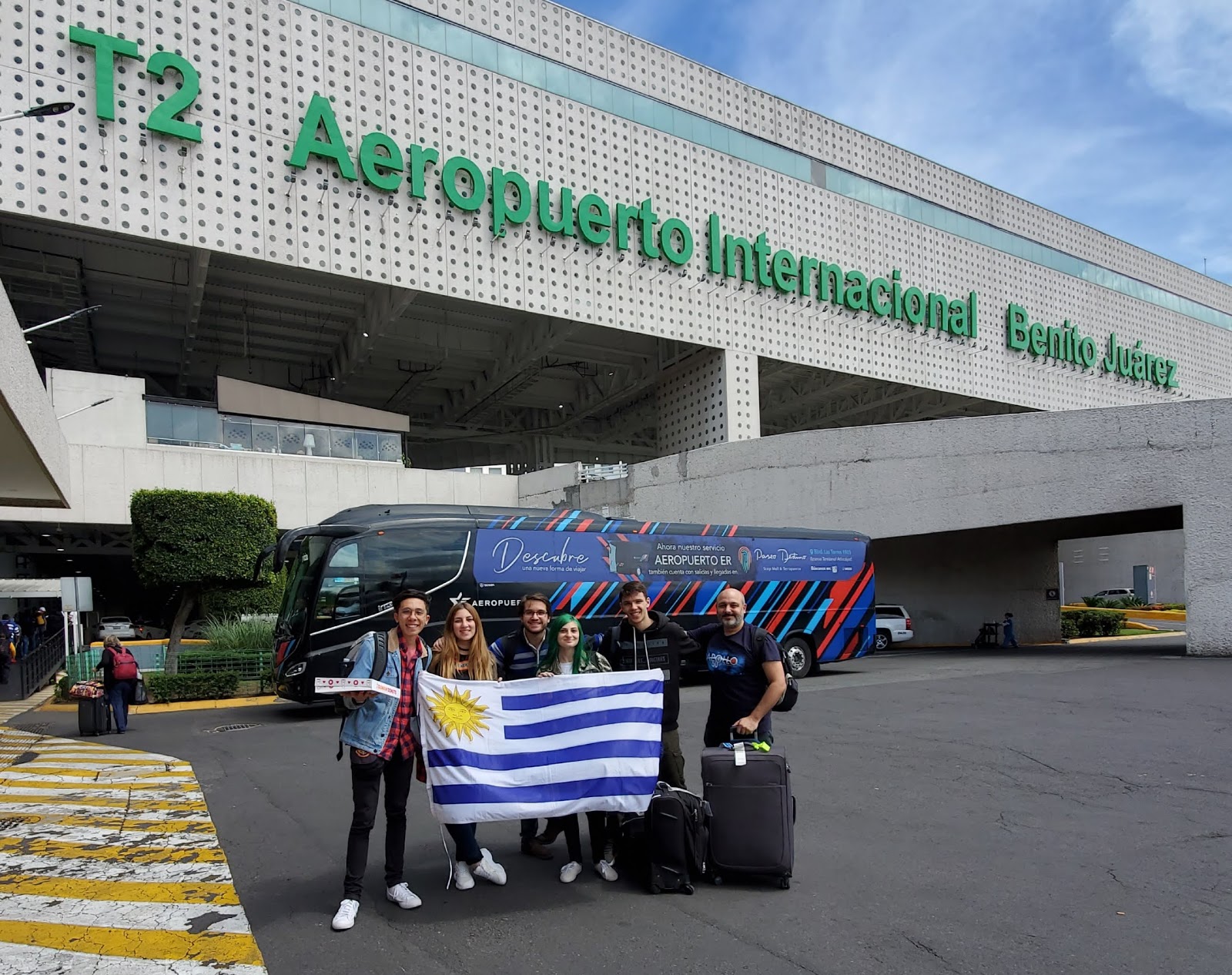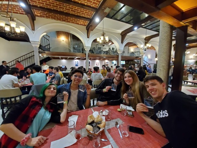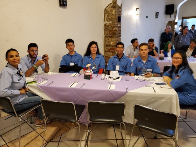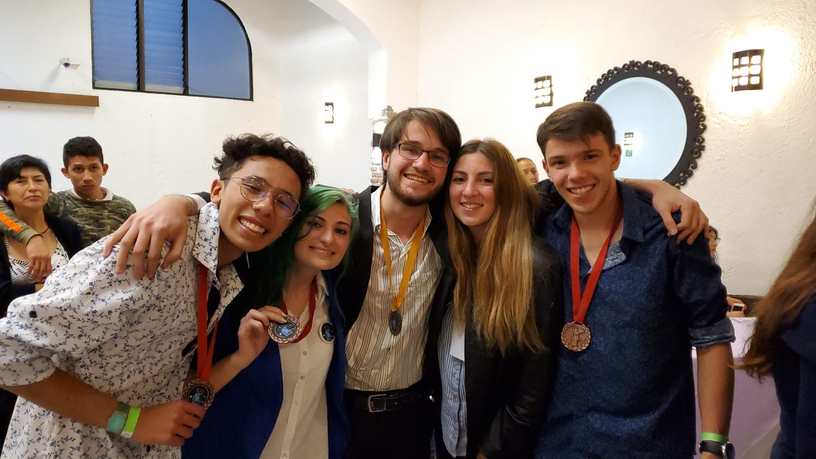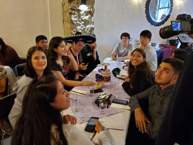 Delegación de Uruguay cenando con Daniela Reyes y Eduardo Valadez, coordinadores de logística de la Olimpiada.