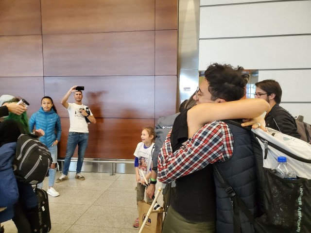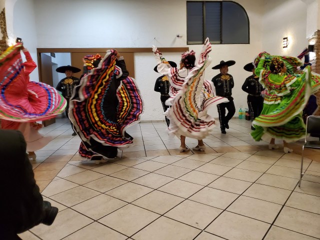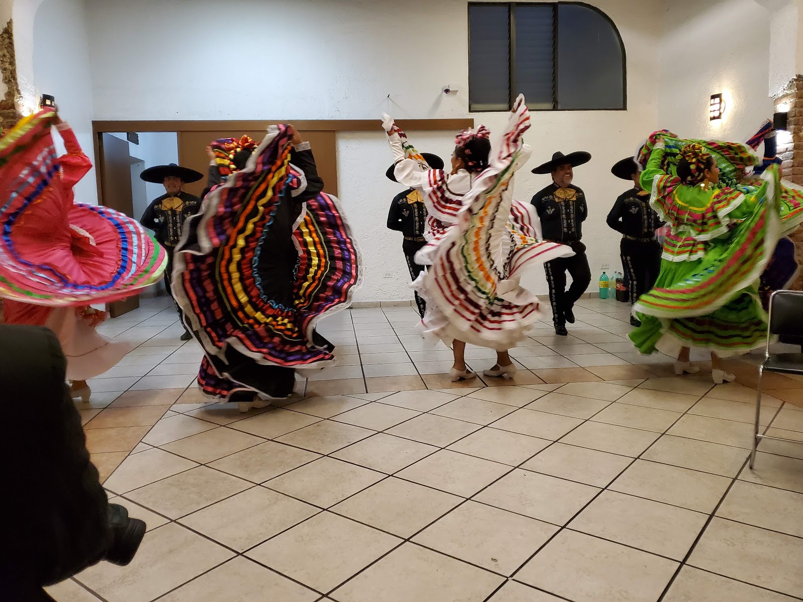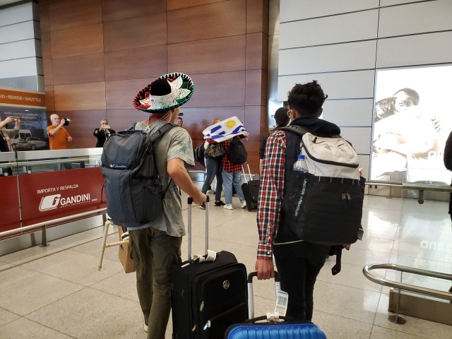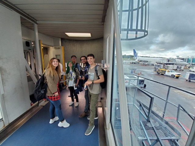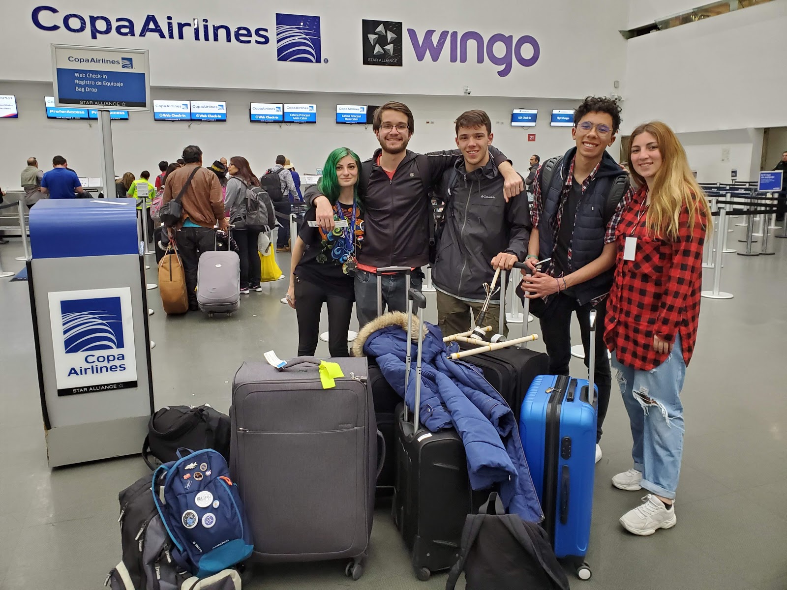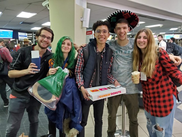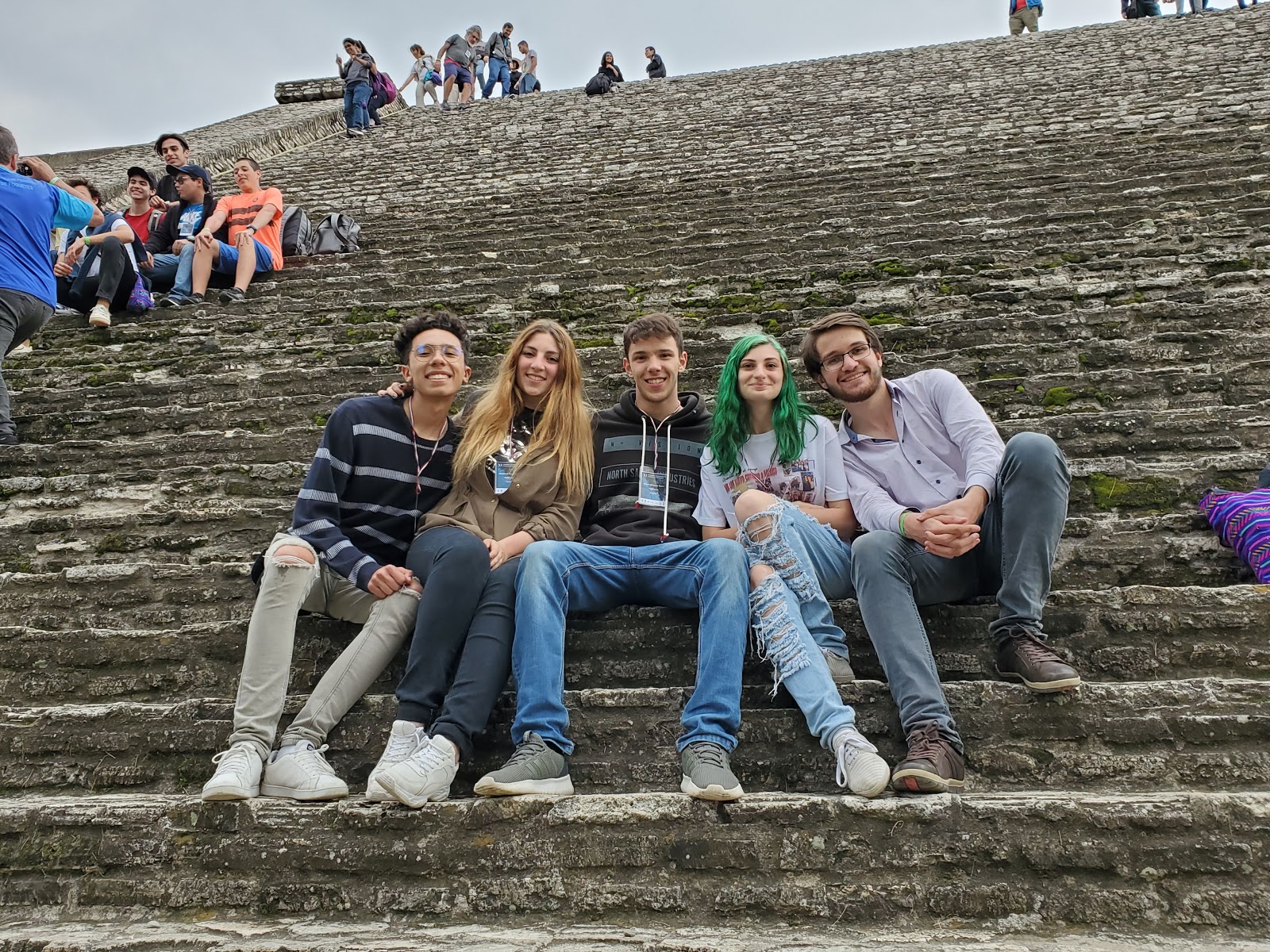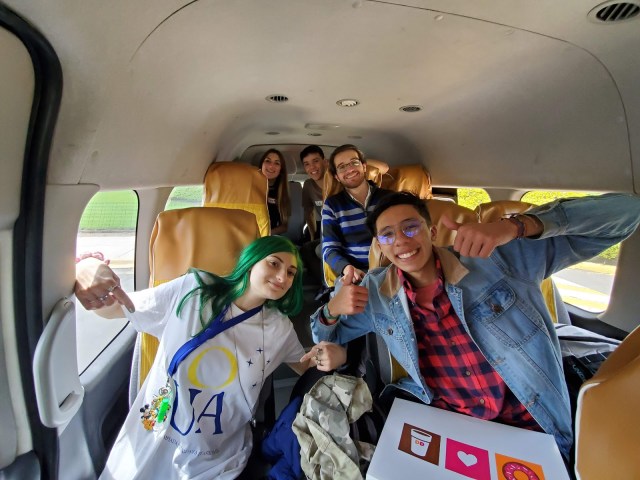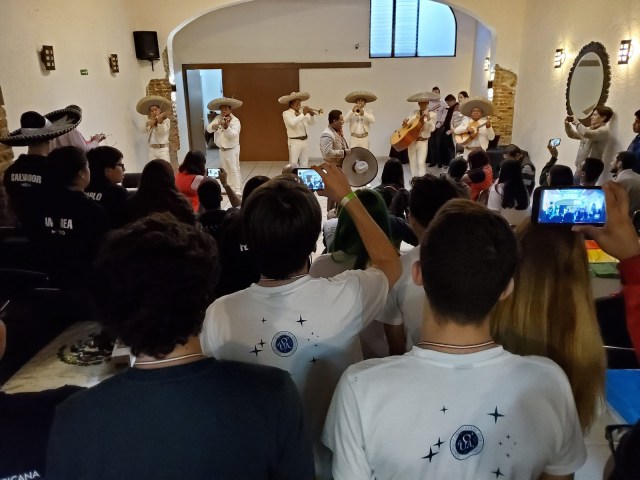Delegación de Uruguay cenando con Daniela Reyes y Eduardo Valadez, coordinadores de logística de la Olimpiada.