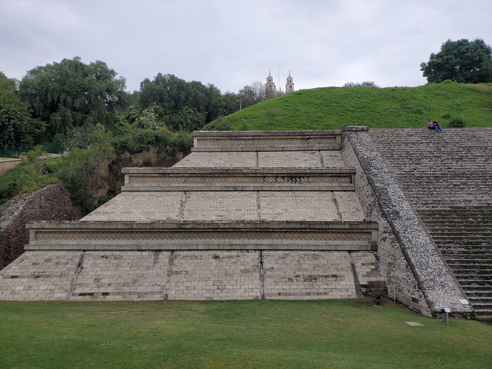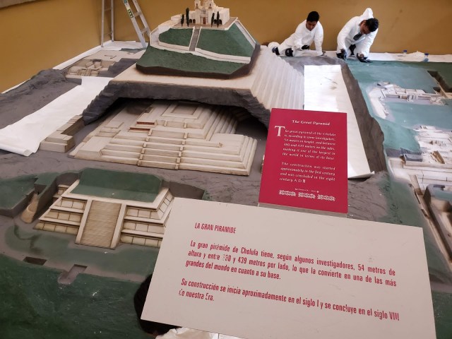 Maqueta de la gran pirámide de Cholula. La más grande del mundo, pero en gran mayoría bajo tierra. En la cima la catedral de Cholula. La parte frontal es casi lo único visible de la gran pirámide.