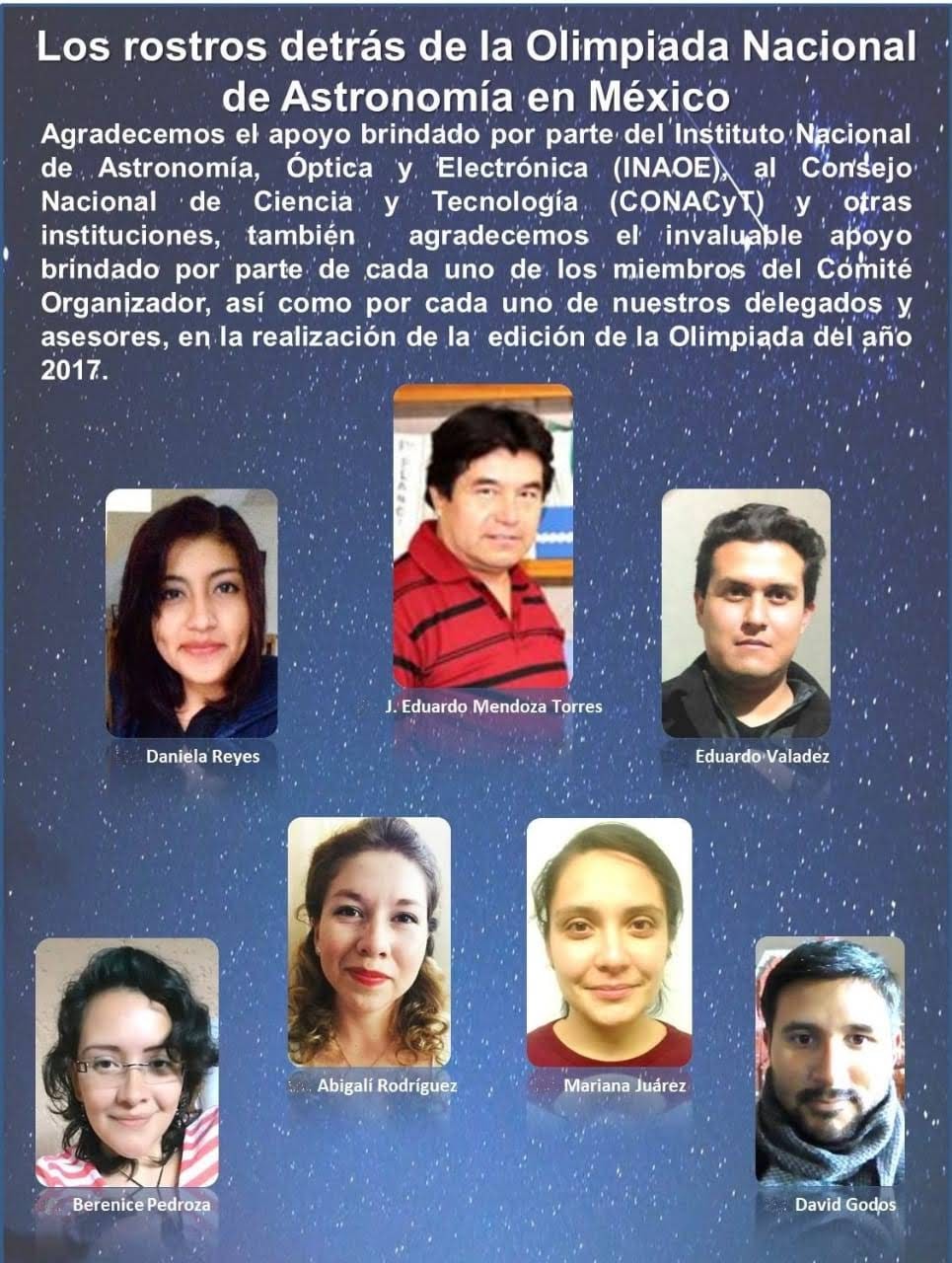 La organización de esta Olimpiada Latinoamericana estuvo liderada por el Dr. Eduardo Mendoza, astrónomo investigador del INAOE, Daniela Reyes, coordinadora de logística con el apoyo de Eduardo Valadez. El comité de problemas estuvo integrado por Mariana Juárez Gamma, David Godos Valencia y Geraldine Laneli Ponce, bajo la supervision del Dr. Lino Héctor Rodríguez. A todos ellos les agradecemos por su gran hospitalidad y una maravillosa olimpiada.