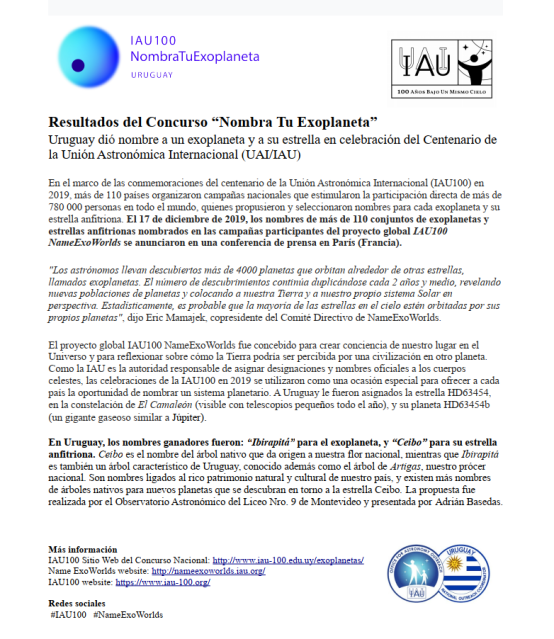 Comunicado de prensa con el resultados del concurso «Nombra Tu Exoplaneta» en Uruguay.
