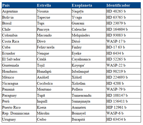 Comparto aquí la lista con los nombres ganadores en los 19 países latinoamericanos que participaron de NameExoWorlds, juntos con sus explicaciones: