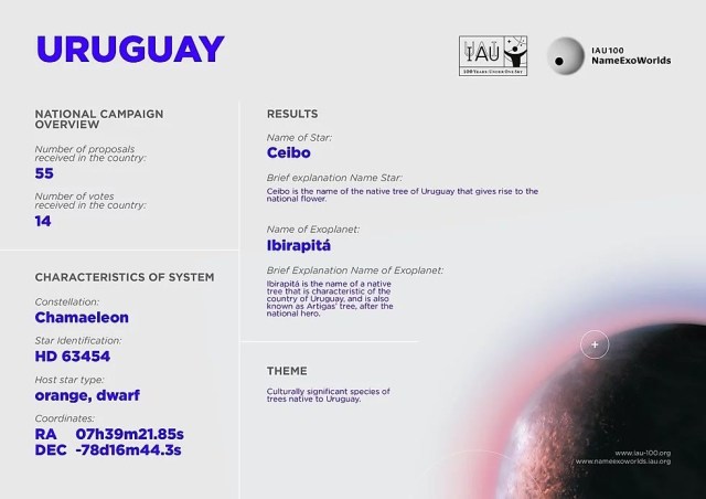 En Uruguay recibimos 55 propuestas para nombrar al sistema HD 63454. La propuesta que resultó ganadora por Uruguay la realizó el profesor de astronomía Adrián Basedas, del Observatorio Astronómico del Liceo Nº 9 de Montevideo. En la fundamentación se afirma que Ceibo e Ibirapitá son «especies culturalmente significativas de árboles nativos de Uruguay». «Ceibo es el nombre del árbol nativo de Uruguay que da origen a la flor nacional», mientras que «Ibirapitá es el nombre de un árbol nativo, característico de Uruguay, también conocido como el árbol de Artigas, en honor al héroe nacional».