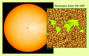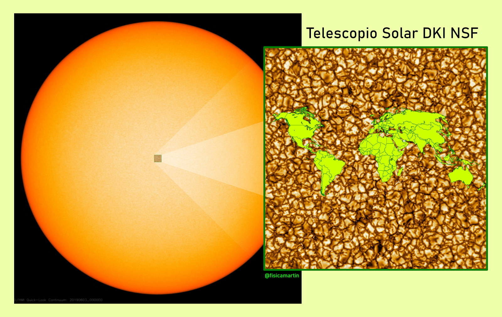 El pequeño cuadrado dibujado en el centro del Sol corresponde al campo visual del DKIST, de 36500 km de lado, capaz de distinguir detalles con una resolución de tan solo 30 km de ancho. En la ampliación de ese cuadro he superpuesto el contorno de los continentes con la imagen obtenida por el DKIST, donde se puede notar que el tamaño de los gránulos solares es comparable al tamaño de algunos países. La proyección utilizada para los continentes es de tipo Goode, que preserva la equivalencia entre áreas de diferentes latitudes.