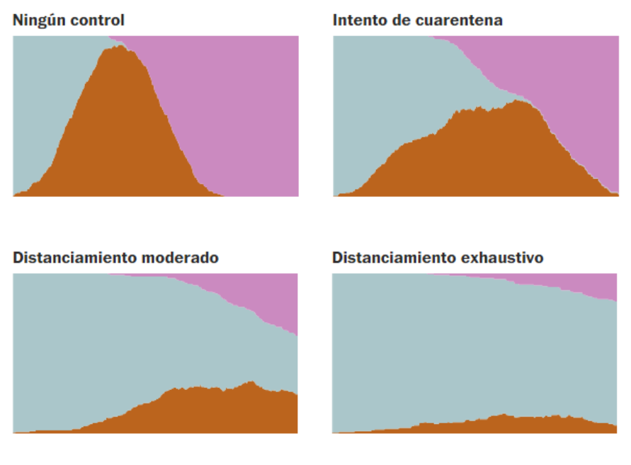 Estas gráficas muestran la evolución de una población simulada ante diferentes escenarios. En un extremo, cuando no se aplican controles, las personas continúan con sus actividades normales, interactuando como siempre. De ese modo el virus pasa de una persona a otra con fluidez, los contagios son muchos de modo que la cantidad de infectados aumenta rápidamente y alcanza a casi toda la población en un período relativamente breve. En el otro extremo, con «distanciamiento social», la cantidad de contactos entre personas es menor y por lo tanto la enfermedad de dispersa de forma mucho más lenta, con lo que se logra «aplanar la curva».