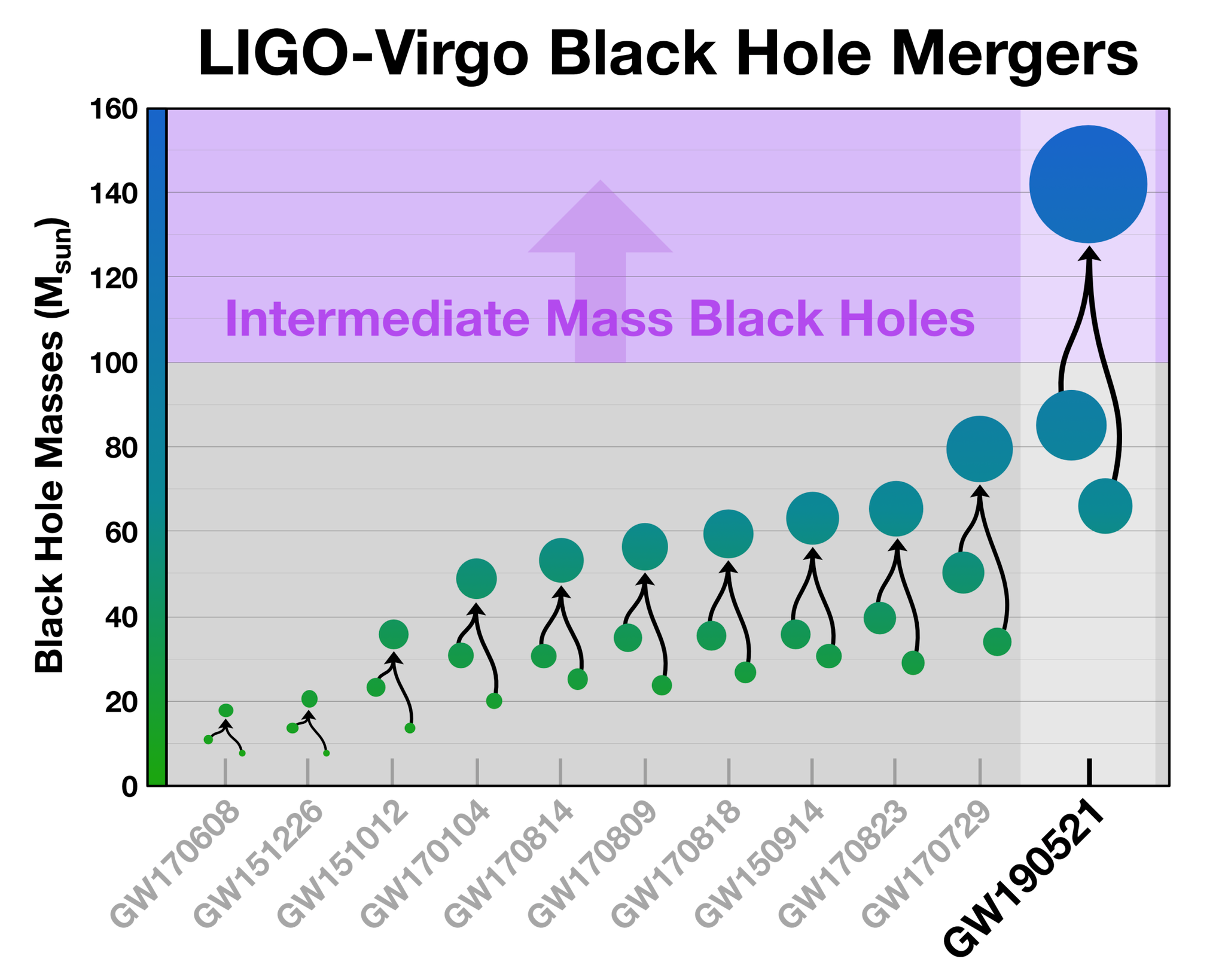 El hito es que se trata de la primera vez que se observa la formación de un agujero negro de masa intermedia. Tiene 142 masas solares, como producto de la fusión de un sistema binario de agujeros negros de 85 y 66 masas solares.