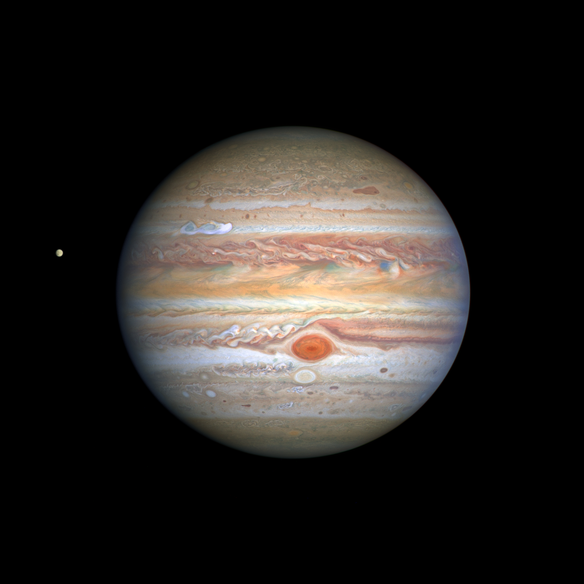 Es imposible no reconocer a primera vista la llamada Gran Mancha Roja, una enorme tormenta de unos 14.500 km de diámetro, tan grande como nuestro Planeta. En momentos de ser fotografiado la distancia de la Tierra a Júpiter era de unos 650 millones de kilómetros, y a pesar de la distancia la imagen esta repleta de aspectos novedosos. Se destaca Europa, una de las lunas galilieanas de Júpiter, arriba a la izquierda de la imagen. Quizá la rotunda presencia de Júpiter le quite algo de protagonismo a Europa en la imagen, pero la realidad es que esta luna es uno de los cuerpos celestes mas interesantes de nuestro Sistema Solar. Europa posee condiciones y propiedades físicas que podrían ser favorables para el surguimiento de formas de vida.