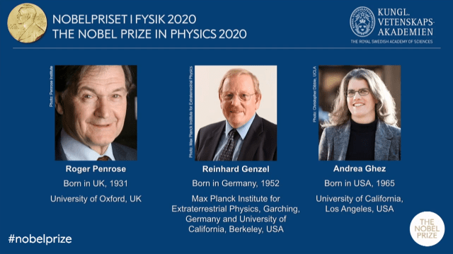 Una mitad del premio Nobel de Física 2020 es compartido entre Reinhard Genzel y Andrea Ghez «por el descubrimiento de un objeto compacto supermasivo en el centro de nuestra galaxia». Lo más notable es que Ghez se convierte así en la primera astrónoma en recibir el Nobel (después de 120 años de premio).