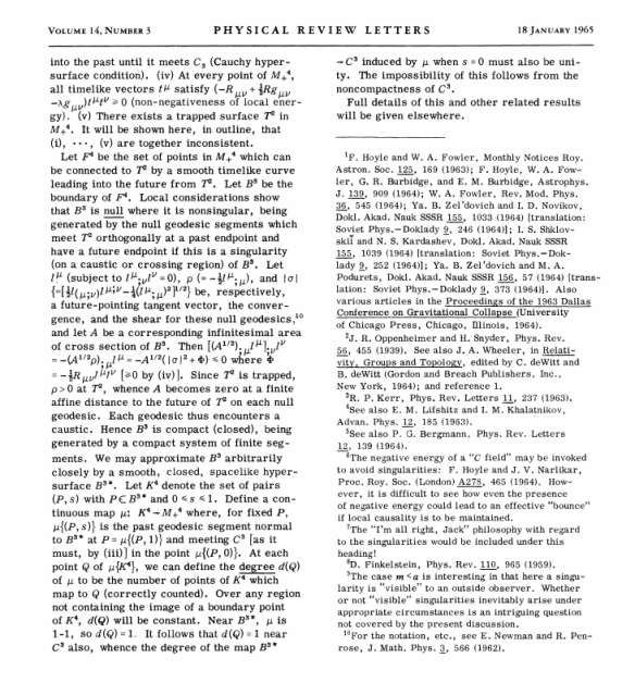 La otra mitad del premio Nobel 2020 se le ha otorgado a Roger Penrose, reconocido como una de las mentes más brillantes de la historia, con aportes a las matemáticas, a la física teórica y hasta la filosofía de la ciencia que son inabarcables para un humano normal. Medio premio Nobel suena a muy poco para semejante genio, pero el Nobel funciona así, reconociendo no tanto trayectorias como contribuciones puntuales. Tal fue el caso de Einstein que no recibió el Nobel por su Teoría de la Relatividad, sino por la explicación del efecto fotoeléctrico y (en forma muy genérica) por sus aportes a la física teórica. En el caso de Roger Penrose el Nobel se ha enfocado en un artículo de 1965 en Physical Review Letters, «GRAVITATIONAL COLLAPSE AND SPACE- TIME SINGULARITIES», donde demuestra que la Teoría General de la Relatividad predice la formación de agujeros negros.