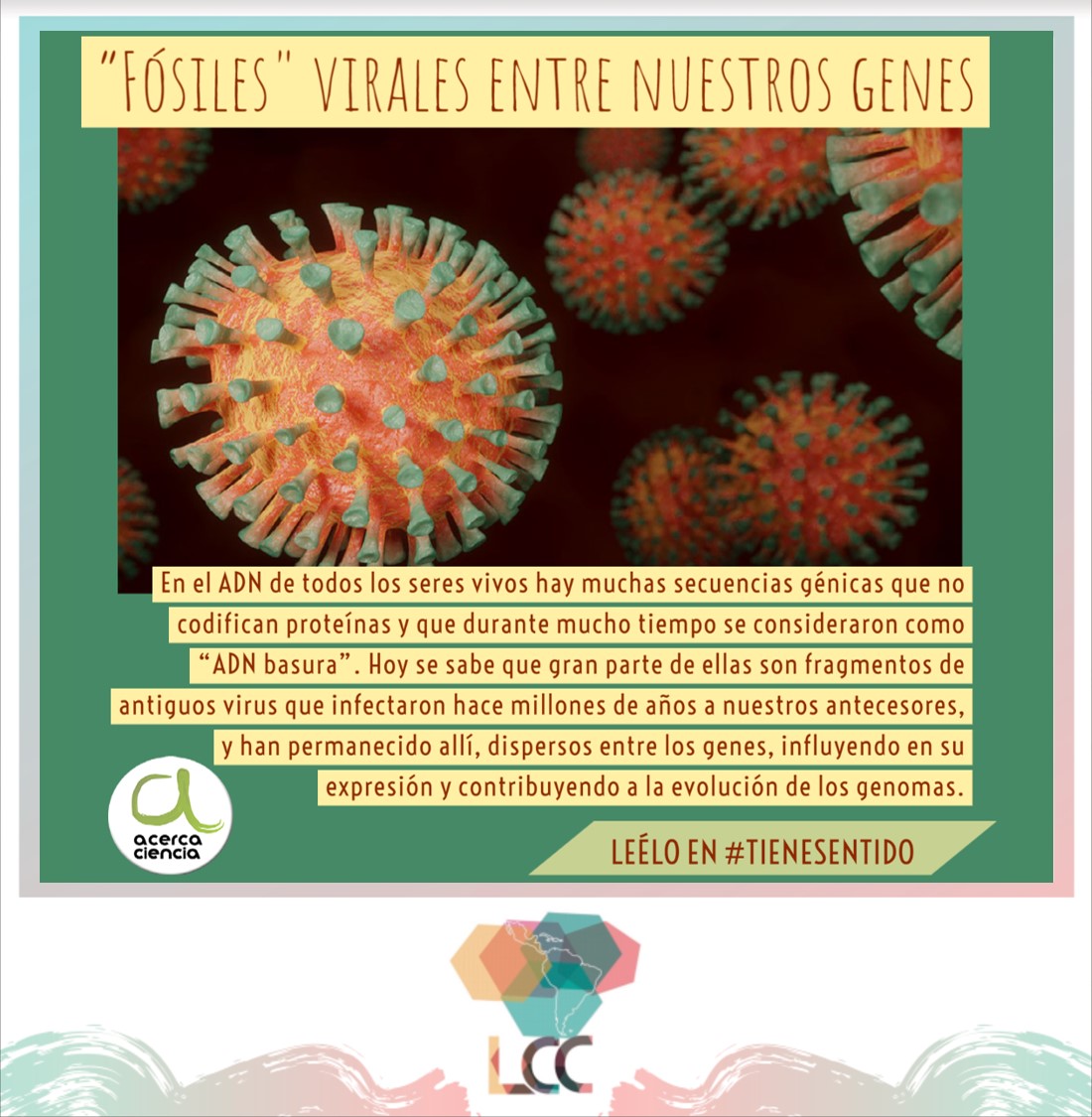 […] En el ADN de todos los seres vivos hay muchas secuencias génicas que no codifican proteínas y que durante mucho tiempo se consideraron como “ADN basura”. Hoy se sabe que gran parte de ellas son fragmentos de antiguos virus que infectaron hace millones de años a nuestros antecesores, y han permanecido allí, dispersos entre los genes, influyendo en su expresión y contribuyendo a la evolución de los genomas. Todo esto nos lo cuentan en esta entrada de AcercaCiencia: https://redlcc.org/2021/04/21/ […]