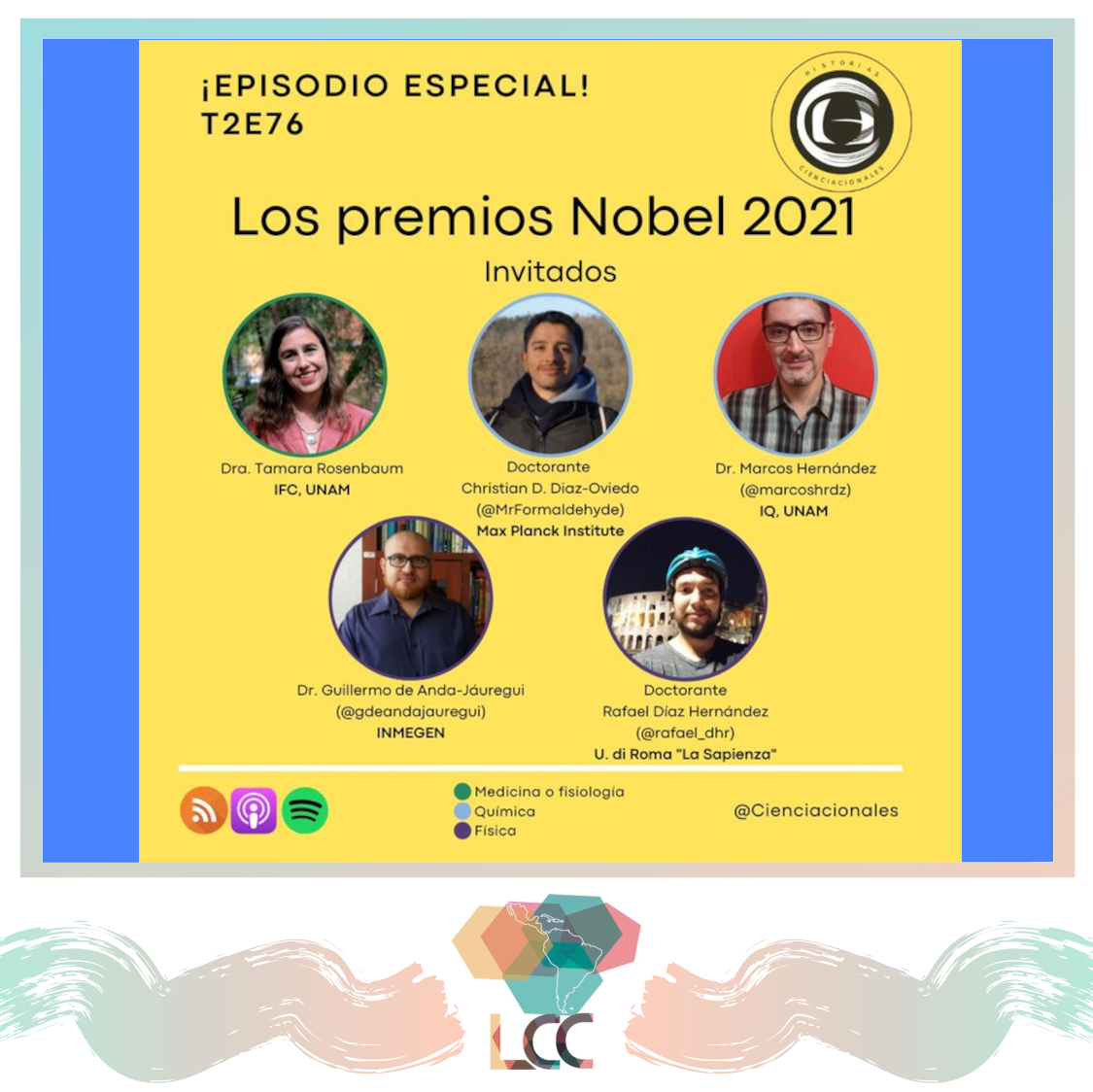 Nuestro episodio especial anual de los premios Nobel tiene este año casa llena, lo cual nos pone muy contentos. Sobre el de Medicina o Fisiología platicamos con Tamara Rosenbaum, que lleva años estudiando las biomoléculas que han sido reconocidos con el premio; del de Química platicamos con Marcos Hernández y Christian Díaz Oviedo, ambos estudian la organocatálisis y Christian forma parte del laboratorio de uno de los laureados, y finalmente del de Física, platicamos con Guillermo de Anda, también especialista en sistemas complejos y en redes, y con Rafael Díaz Hernández, que forma parte del laboratorio de uno de los premiados. ¡Un verdadero Nobel-fest!