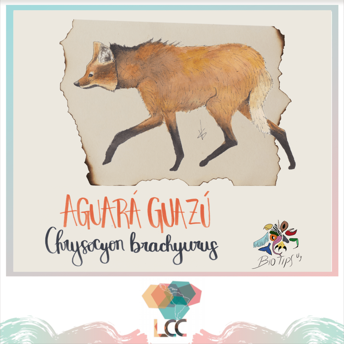 El Aguará Guazú (Chrysocyon brachyurus) es una especie que pertenece al grupo de los mamíferos. Mide aproximadamente 80cm de altura. Se encuentra presente en parte del Uruguay y parte de América del Sur. Su estado de conservación se cataloga como Casi Amenazada (NT), pero en el Uruguay se considera Amenazada es decir que tiene una baja distribución y no es abundante. Frecuenta floraciones de tipo parque , zonas abiertas, inundables, con pastizales altos y pajonales salpicados de islas de bosque y arboles aislados. Si quieres saber más sobre esta especie visita nuestra publicación.