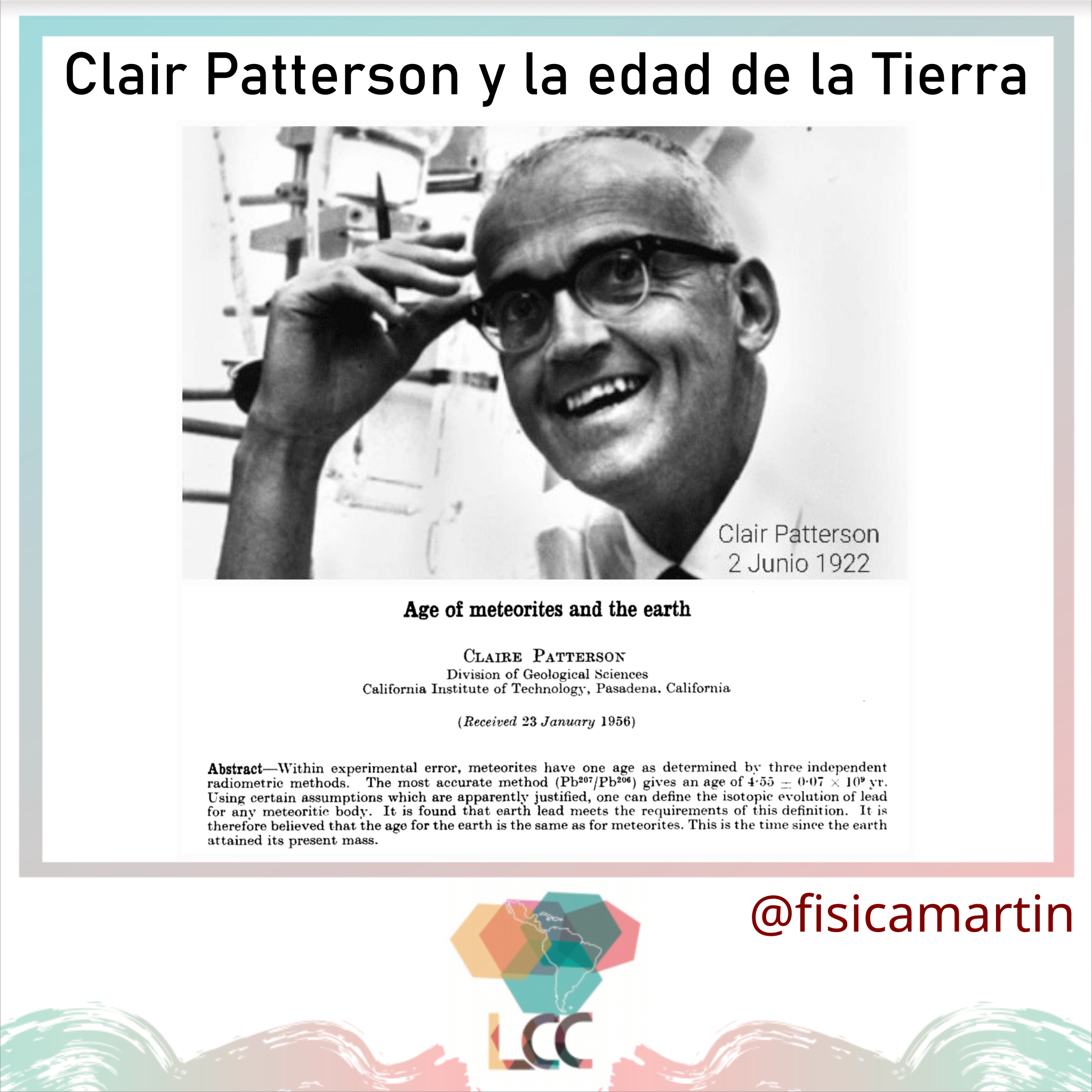 Hace 100 años nacía el geoquímico Clair Patterson, el 2 de junio de 1922, que realizó la primera estimación precisa de la edad de la Tierra en 4,55 mil millones de años. Su hallazgo, a partir de medidas radiométricas de meteoritos, fue publicado en el paper … … [seguir leyendo]
