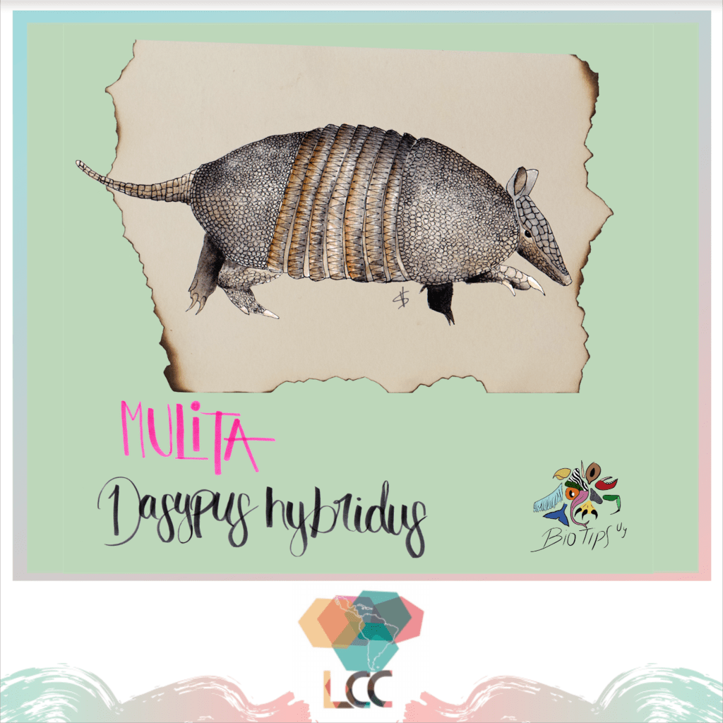 La Mulita (Dasypus hybridus) es una especie que pertenece al grupo de los mamíferos. Su largo total es de aproximadamente de 40-50 cm y pesa de 1-2 kg. Se encuentra presente en todo el Uruguay y parte de América del Sur. Su estado de conservación se cataloga como casi amenazada (NT), con tendencia poblacional a la baja. Habita en praderas, pastizales y chircales. Si quieres saber más sobre esta especie vista nuestra publicación.