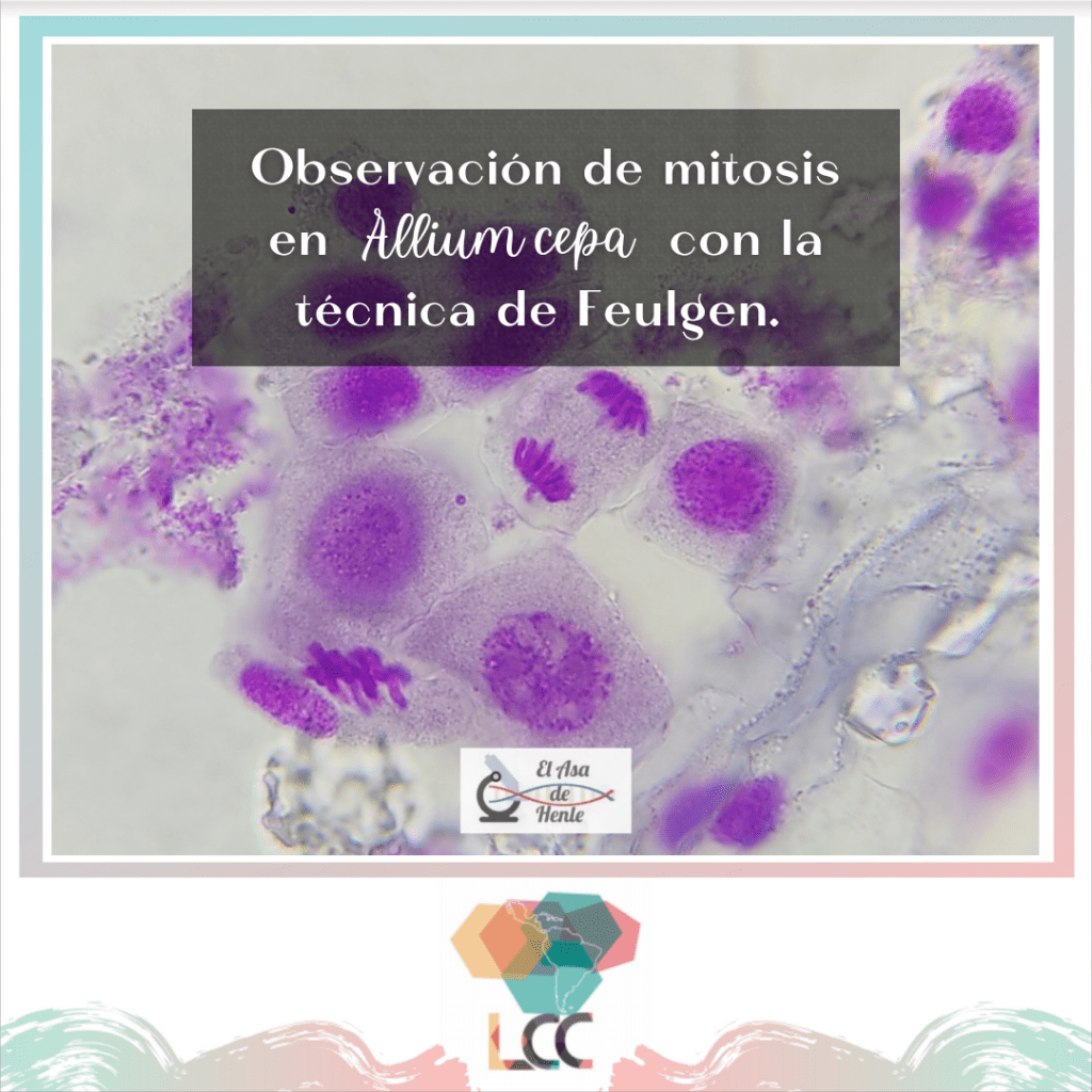 Feulgen es una técnica histoquímica específica para identificar ADN. En esta experiencia nos permite observar distintas etapas de la mitosis en células de las raíces de cebolla (Allium cepa). Léelo completo en https://elasadehenle.wordpress.com/2022/08/27/observacion-de-mitosis-en-celulas-de-cebolla-con-la-tecnica-de-feulgen/